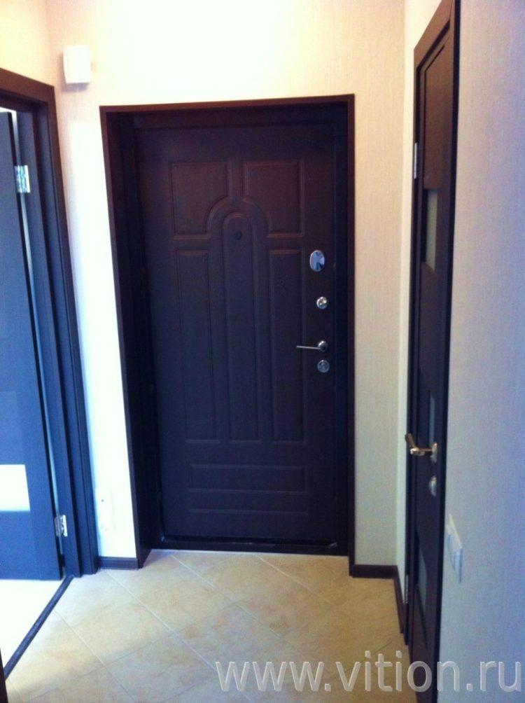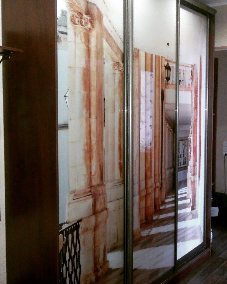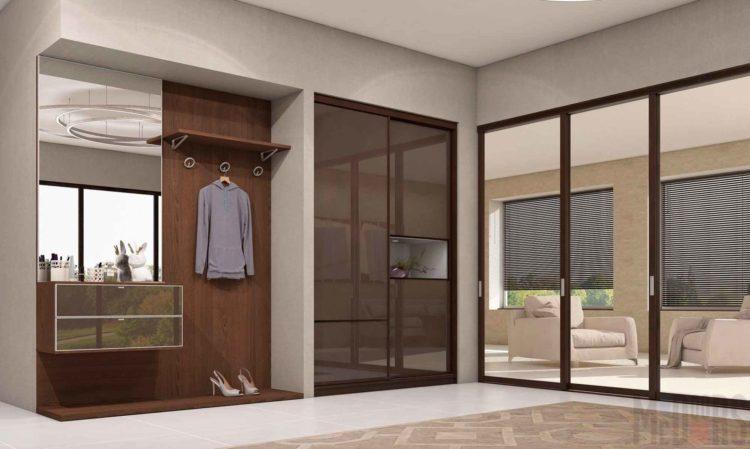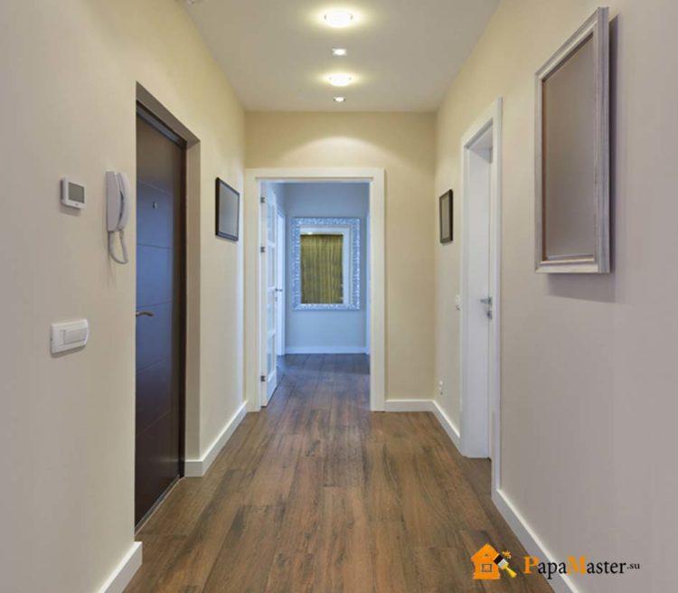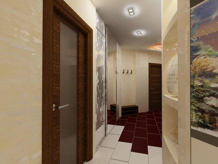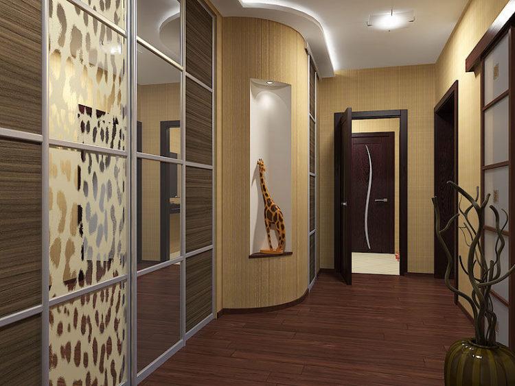 Un pasillo estrecho, cuyo diseño fotográfico en el apartamento proporciona la presencia de una gran cantidad de tonos marrones, debido a su variabilidad, facilita el acceso a la habitación de cualquier color.