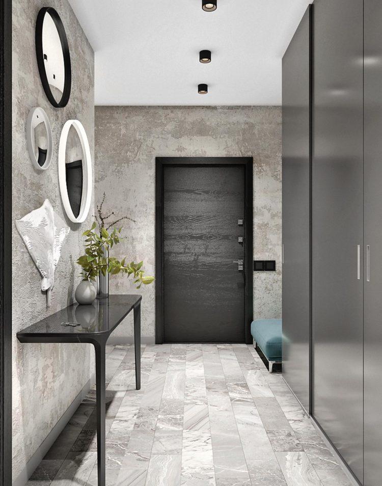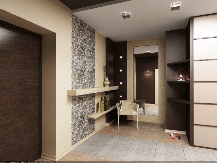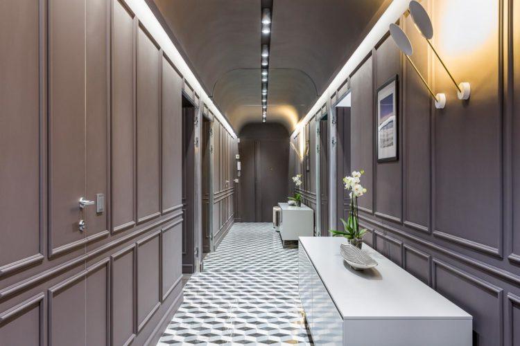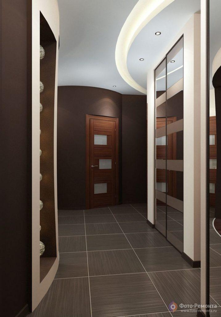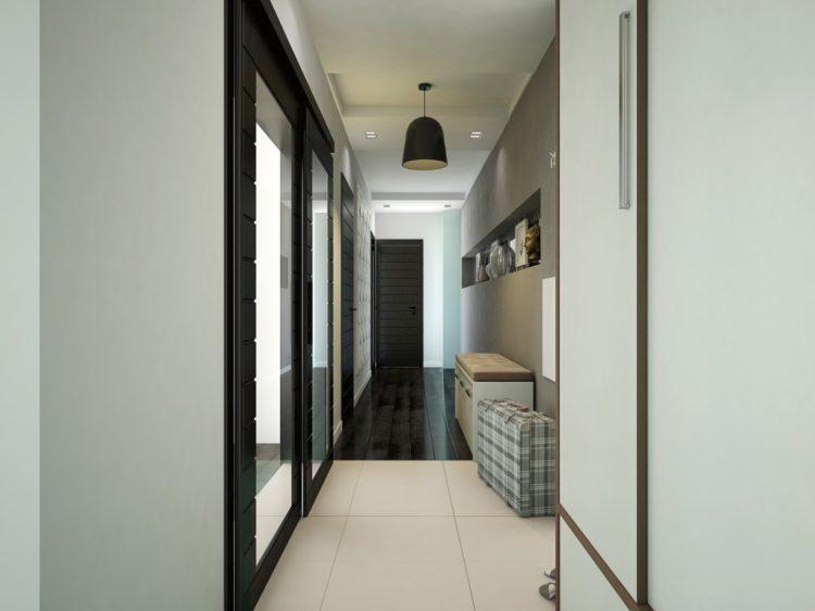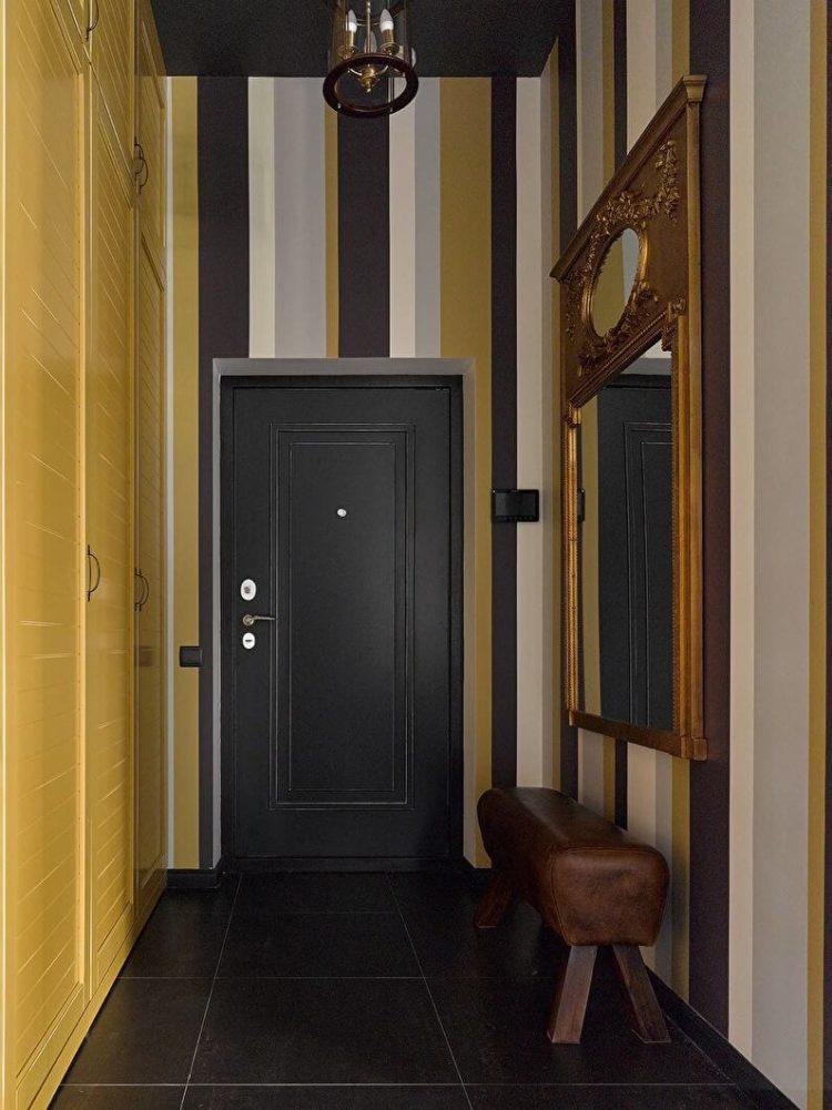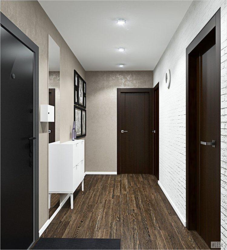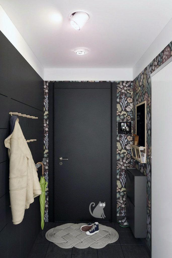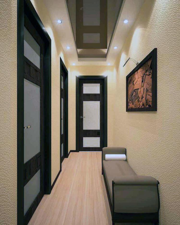 Cuando el interior del corredor en el departamento es estrecho, no lo haga negro.Te sentirás como si estuvieras entrando en una cueva. La única excepción es cuando el corredor es pequeño. Se puede realizar fácilmente en medios tonos negros.