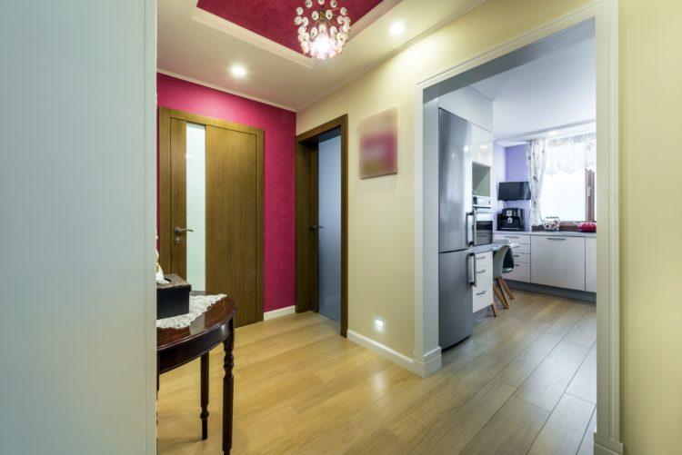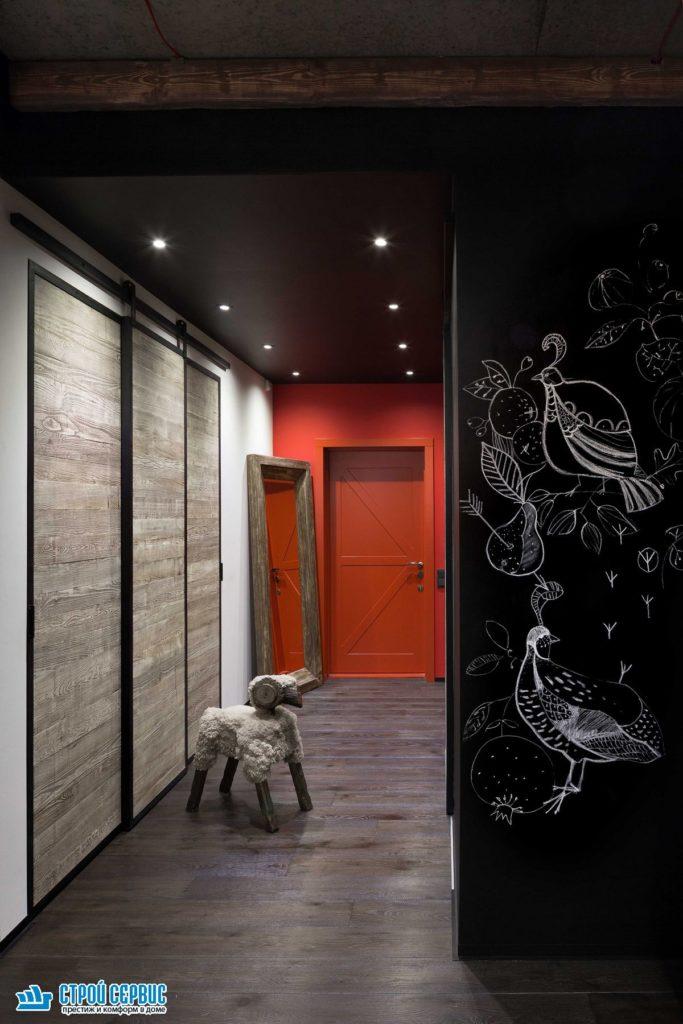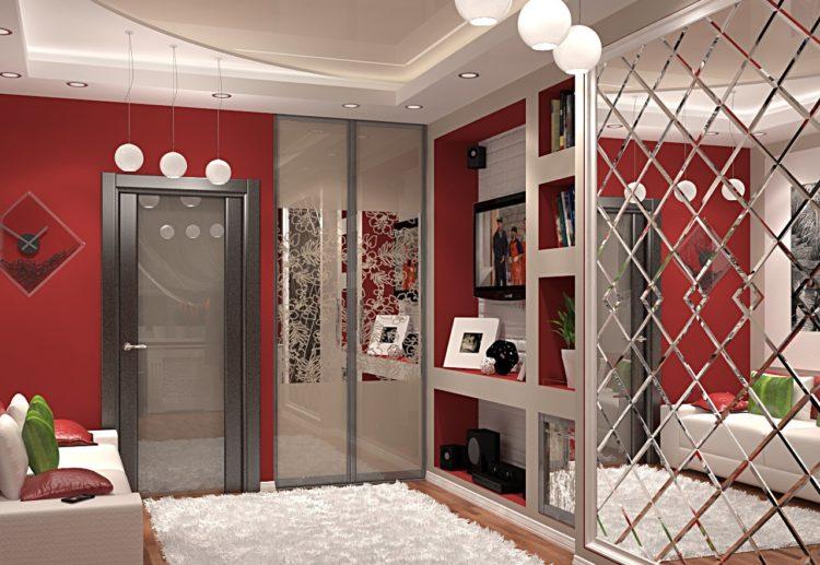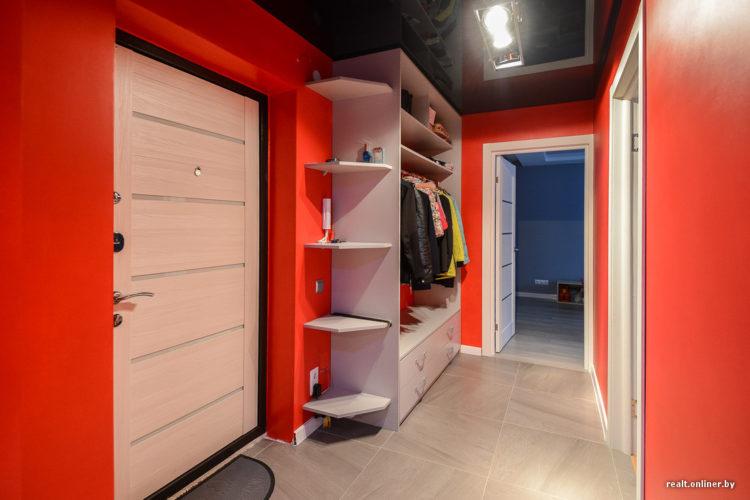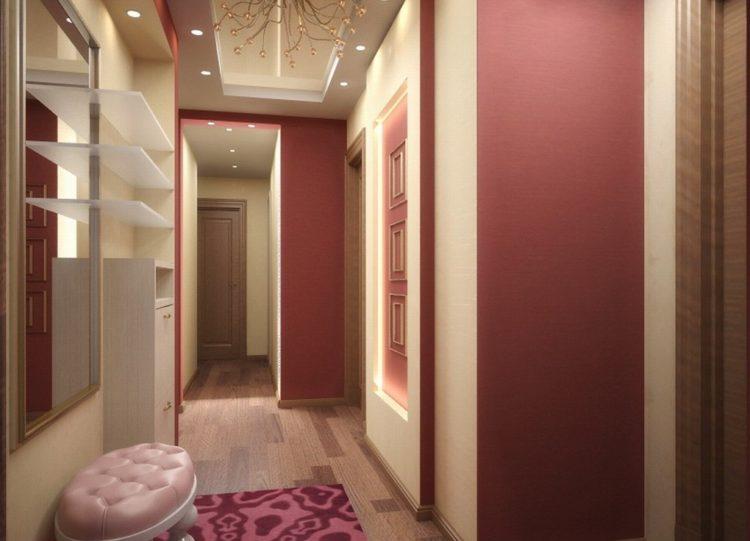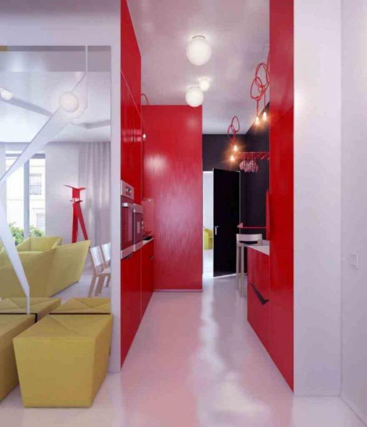 El pasillo estrecho y largo, el diseño, el interior, las ideas y soluciones que está buscando, se pueden decorar en rojo. En este caso, es mejor combinarlo con blanco, gris o negro. El predominio del rojo puede crear molestias durante la estancia en el corredor.