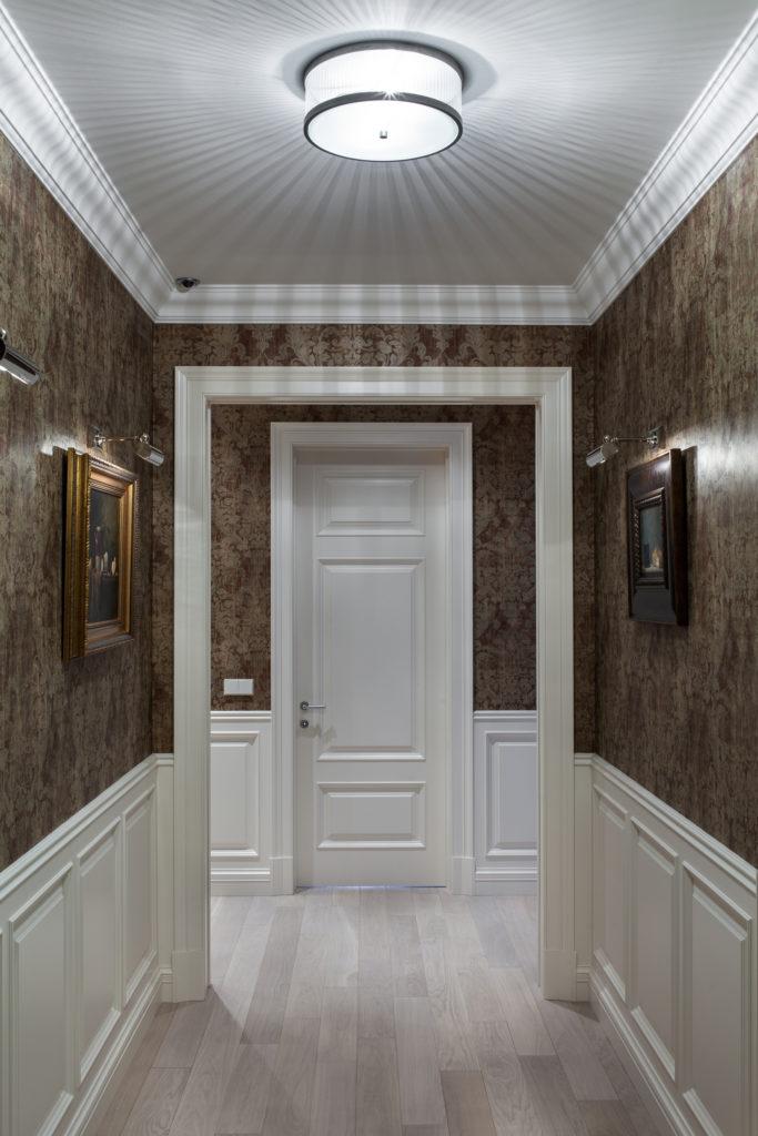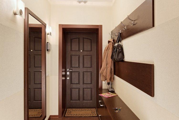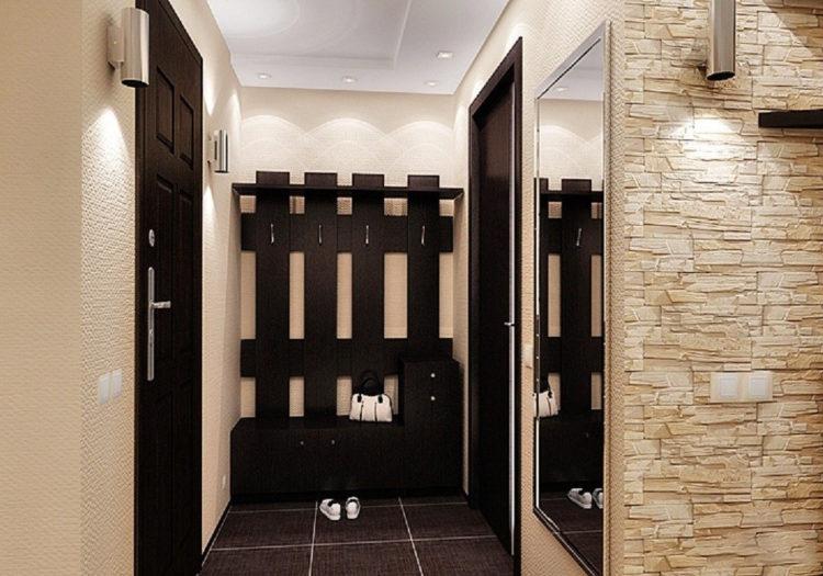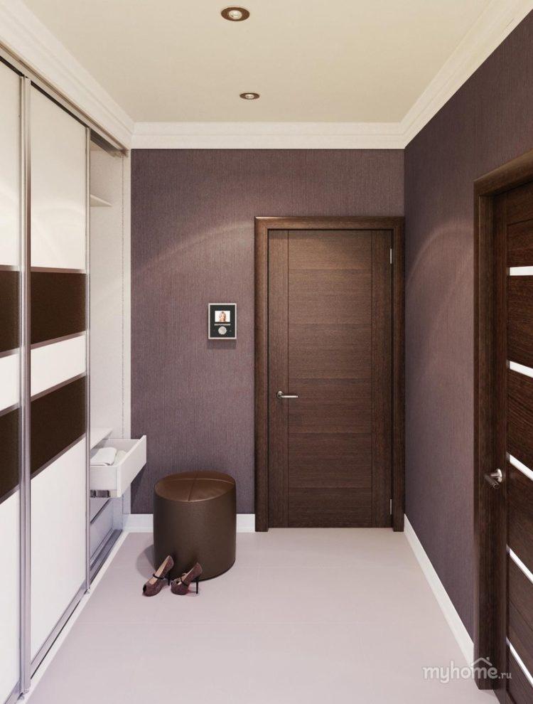 El diseño de un pequeño corredor en el apartamento se puede realizar con papel tapiz oscuro. Es deseable combinarlos con otras opciones de contraste ligero.