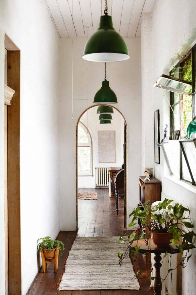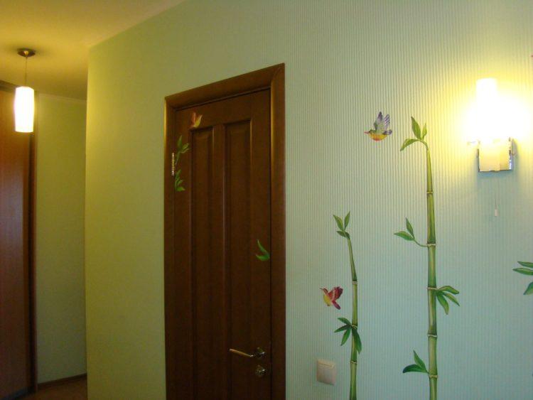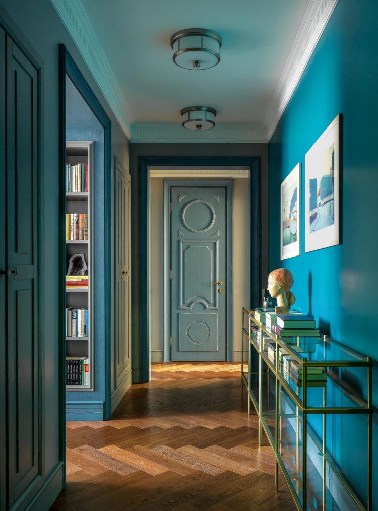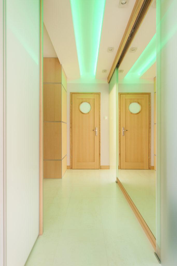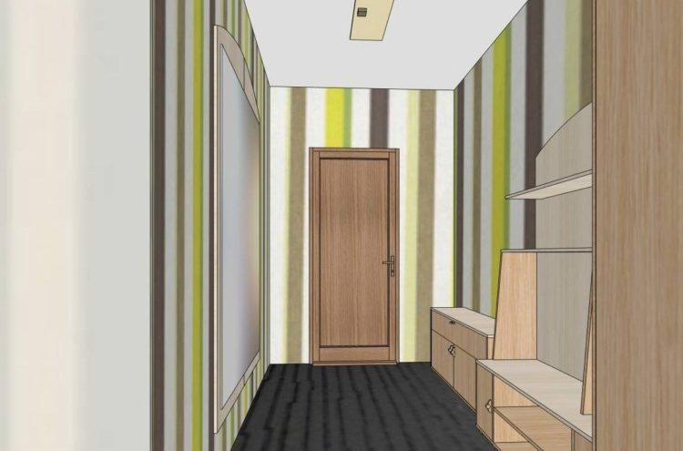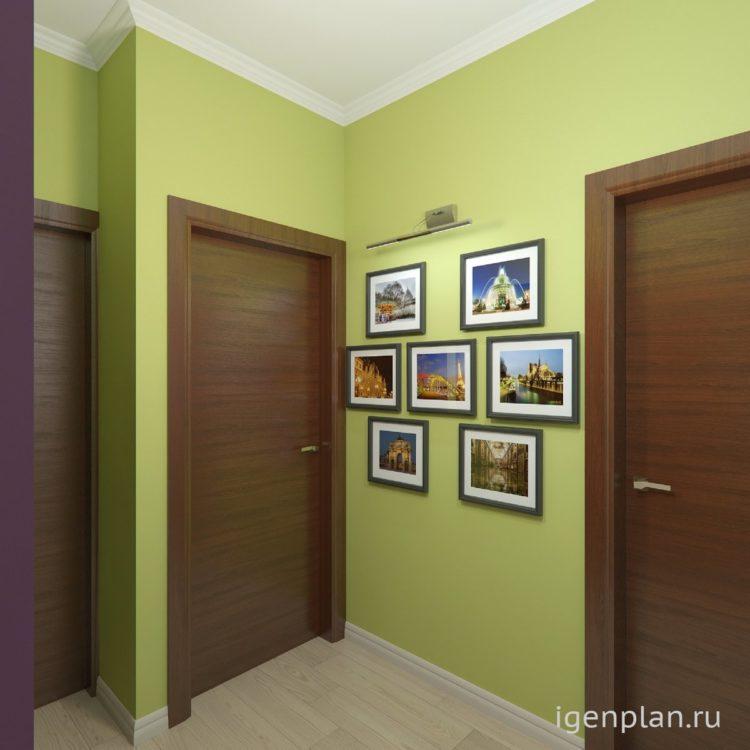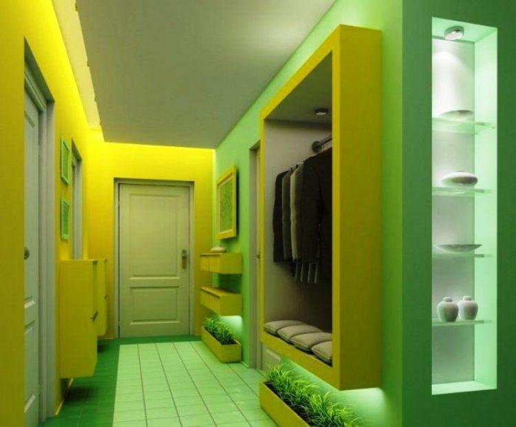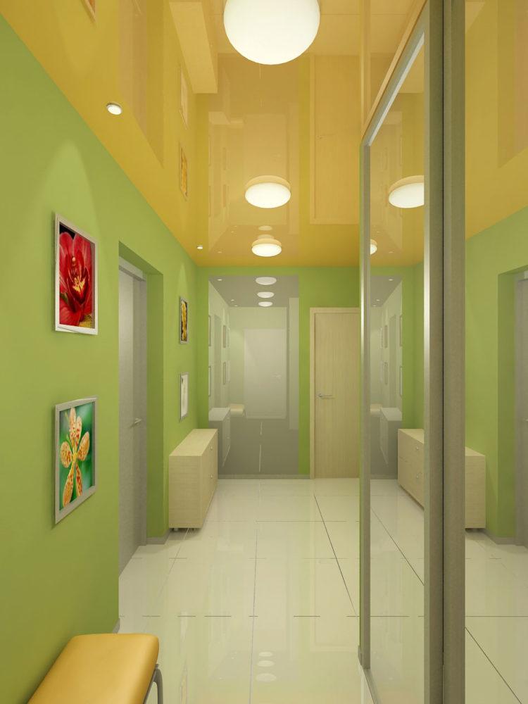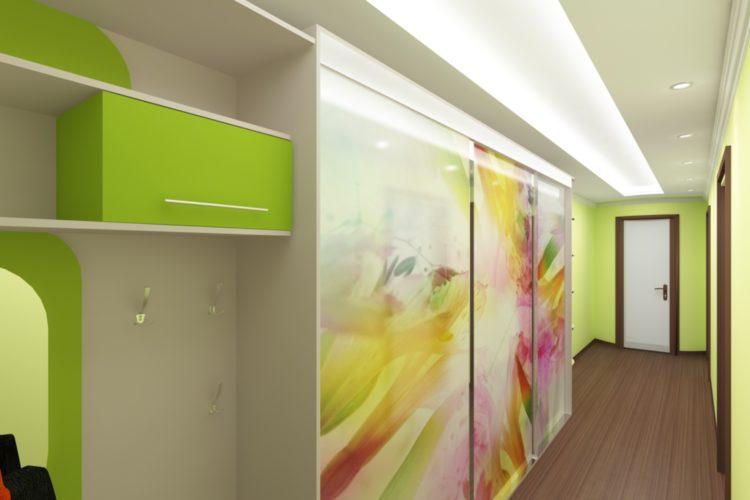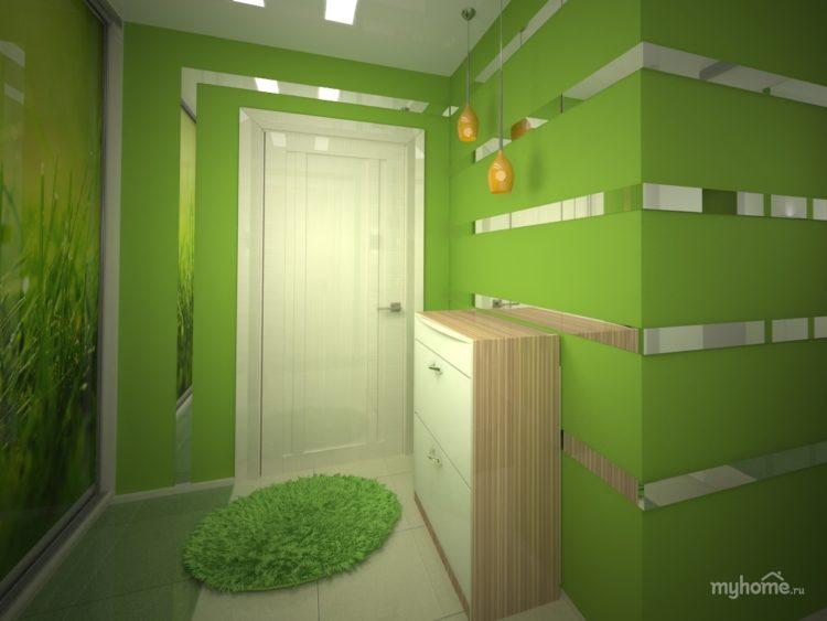 El diseño de un pasillo largo en un departamento con un tinte verde solo es adecuado si el pasillo conduce a una habitación donde prevalece este color. Tenga cuidado de no crear un fuerte contraste que afecte negativamente la experiencia general de sus invitados.