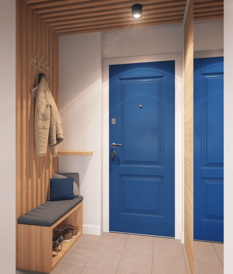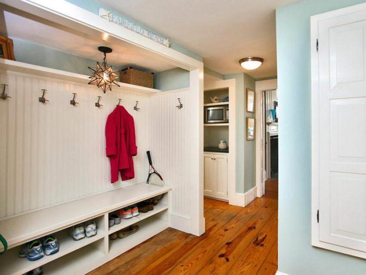 Un hall de entrada blanco con un ancho de no más de 1.5 metros no atraerá a aquellos que viven en una casa con niños pequeños. Querrán hacer reparaciones. Las soluciones en blanco se ensucian muy fácilmente, aunque parece bastante espaciosa.