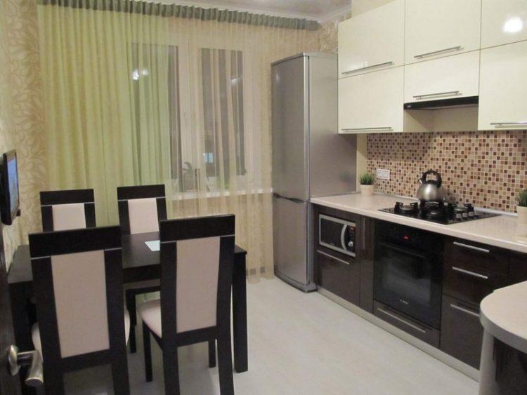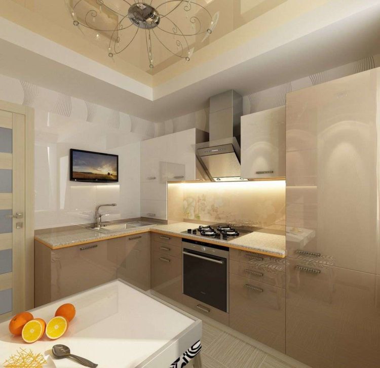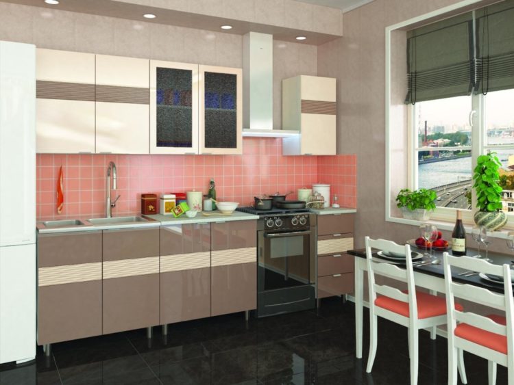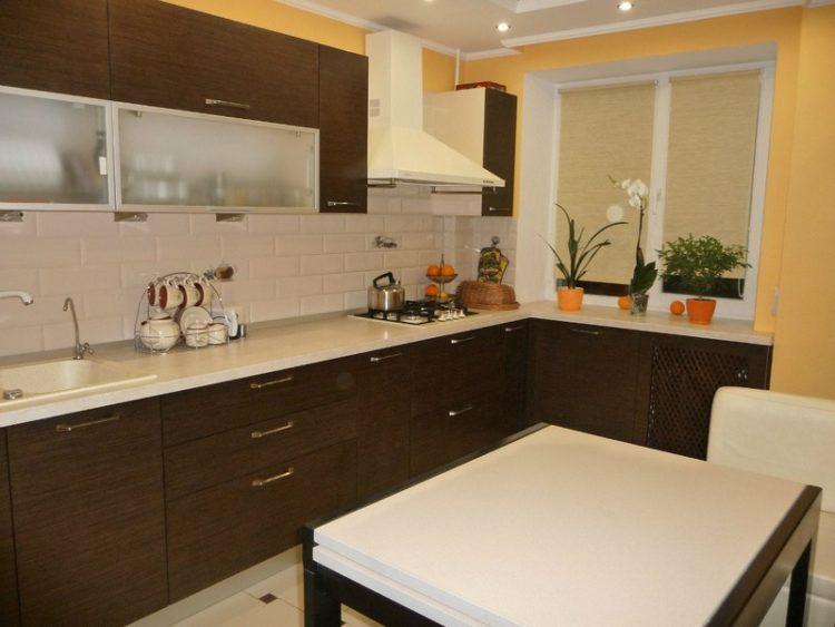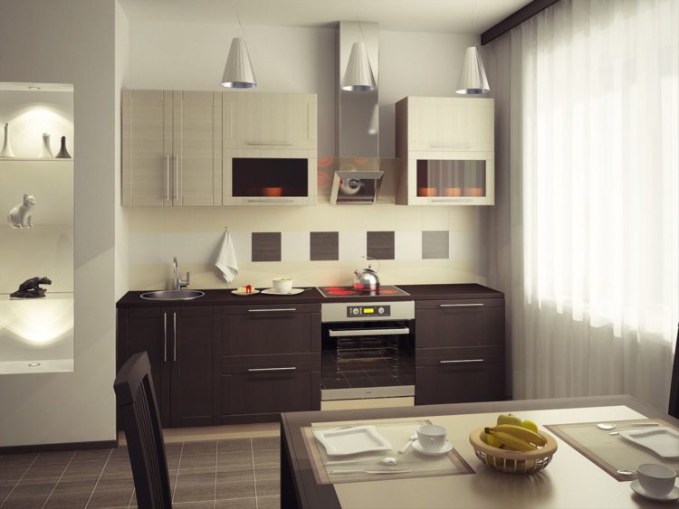 En este caso, puede hacer que las paredes de la habitación tengan forma de vainilla, las puertas de los muebles inferiores y superiores en blanco y la encimera en color wengué. El resultado es una imagen muy equilibrada y bonita.