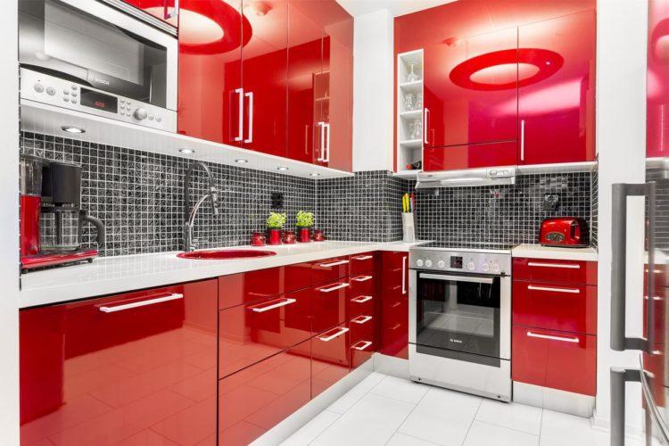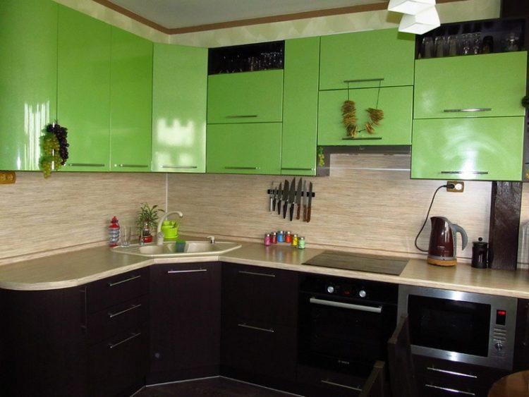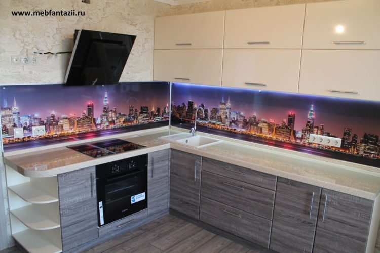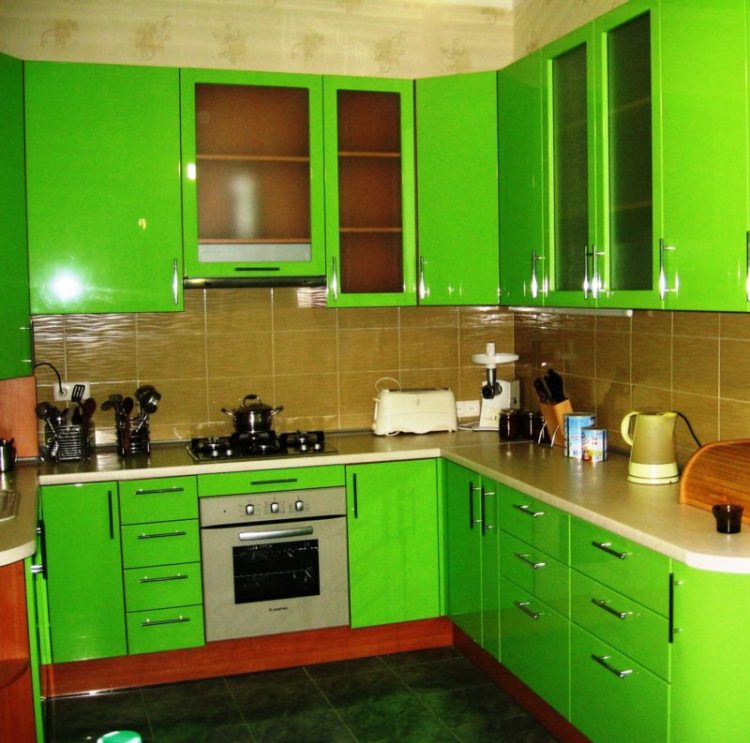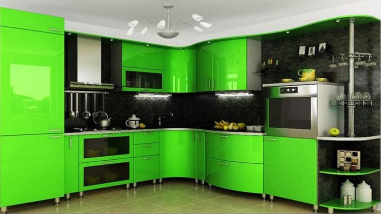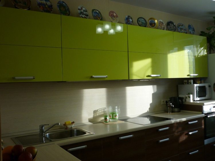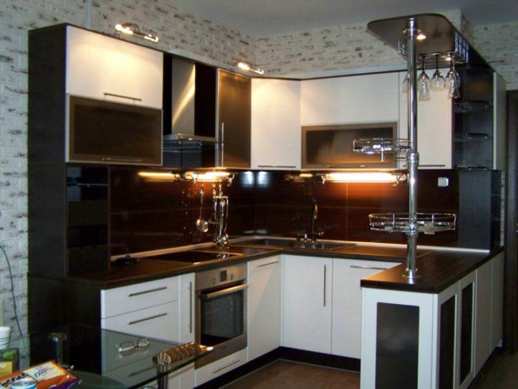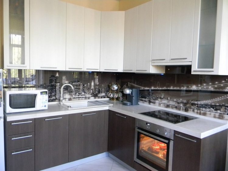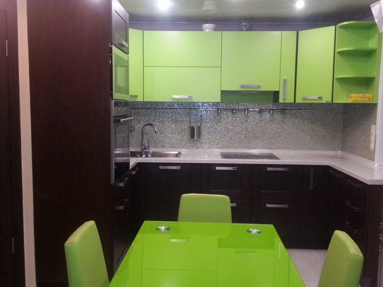 Para crear un estilo más atractivo, puede hacer que las paredes de la cocina sean de vidrio oscuro o azulejos.