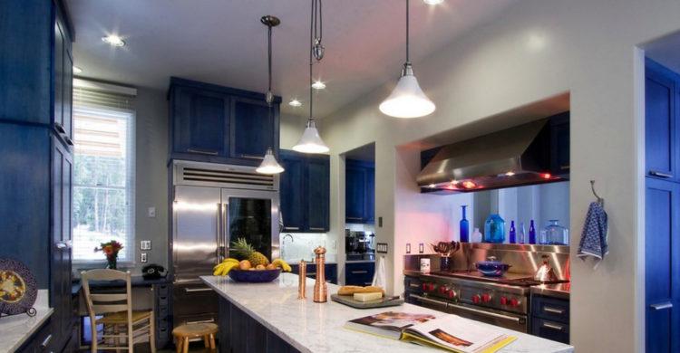 Estas opciones no son adecuadas para muebles clásicos en los mismos colores beige. Es mejor comprar e instalar estos elementos de luz en aquellas habitaciones en las que ya hay al menos algo azul.