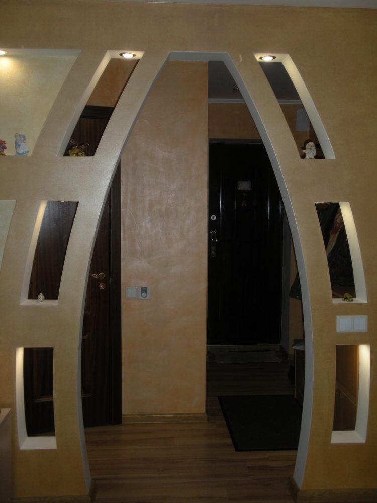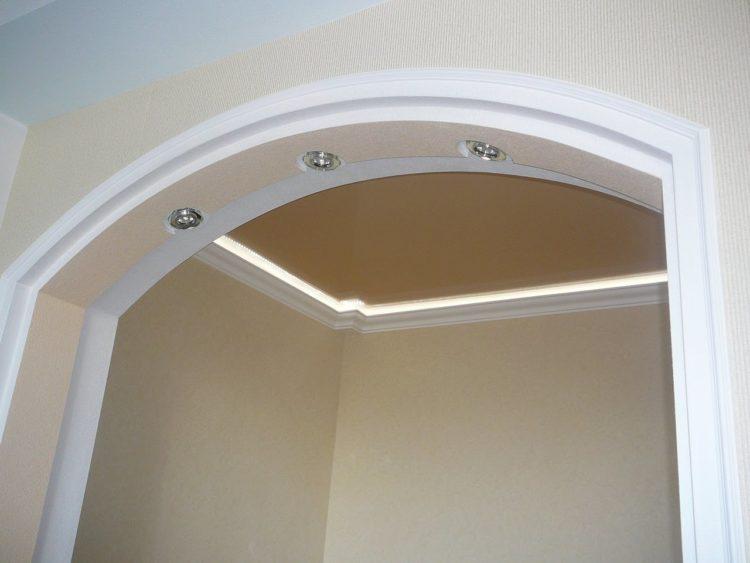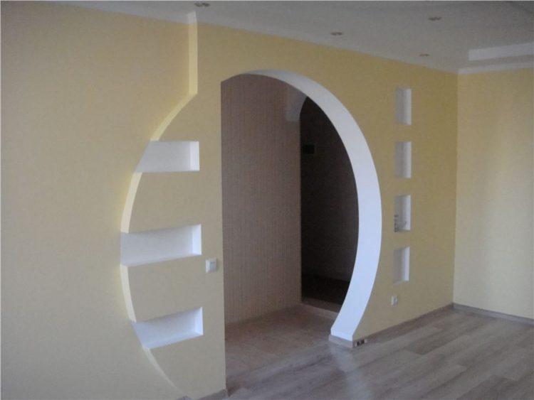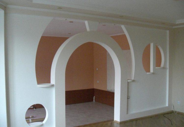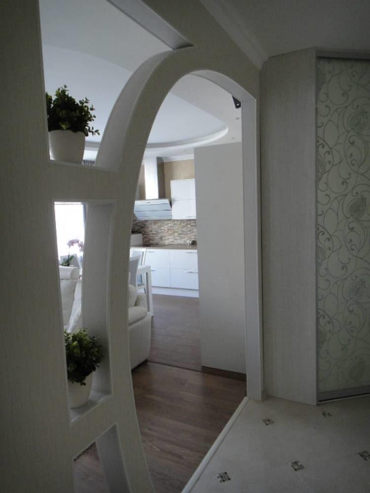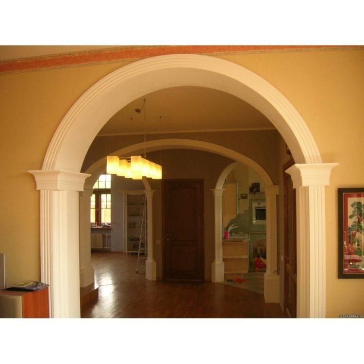 Cualquier puerta de la casa se puede decorar con un arco redondo, cuadrado o cualquier otro arco beige hecho de paneles de yeso. Este color es universal, mientras que en el arco puede hacer huecos que servirán como estantes.