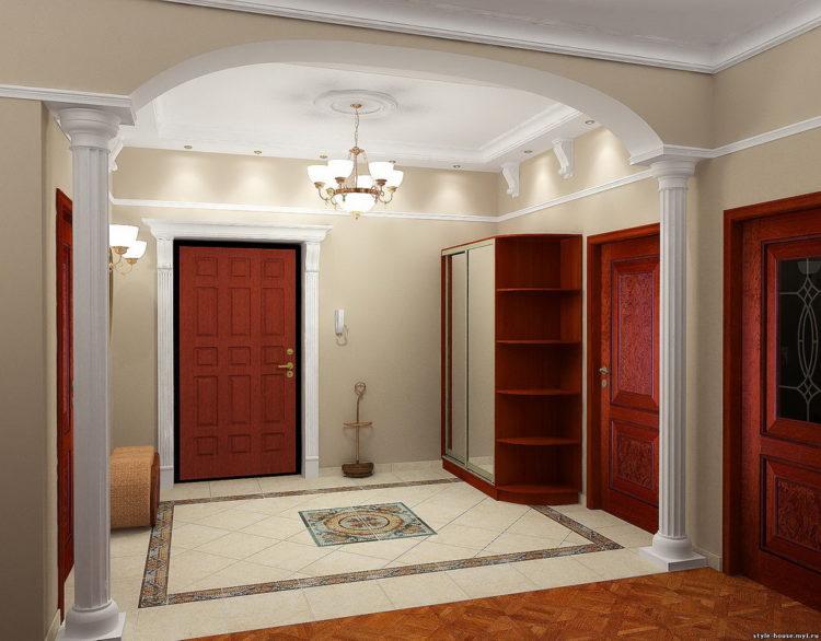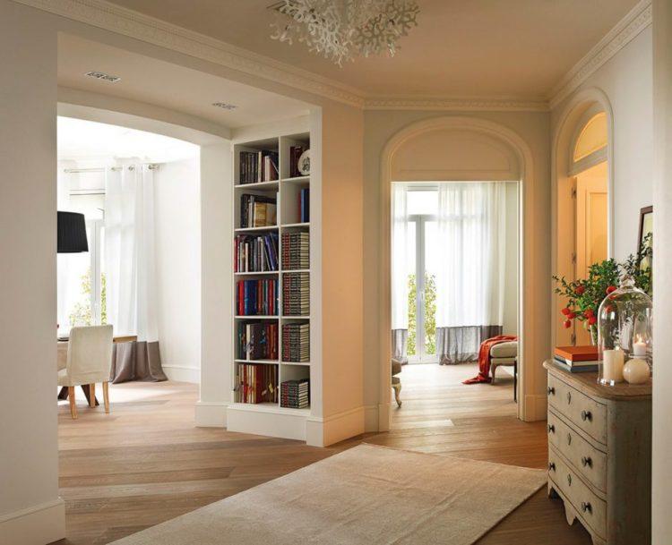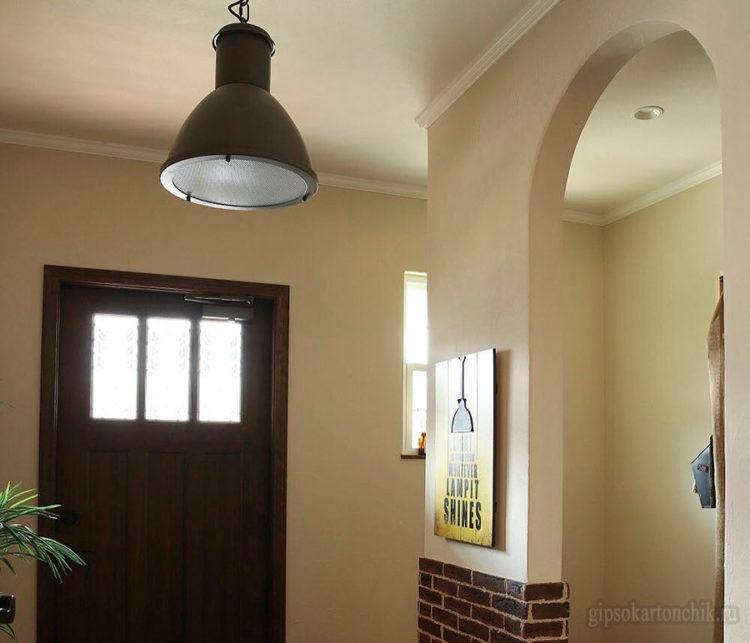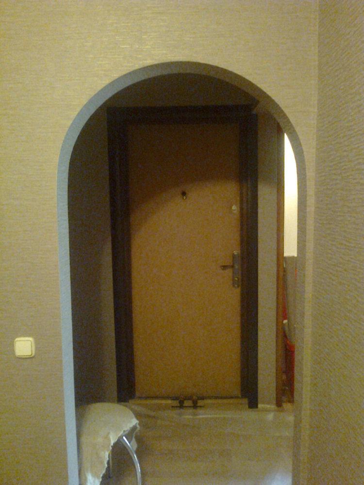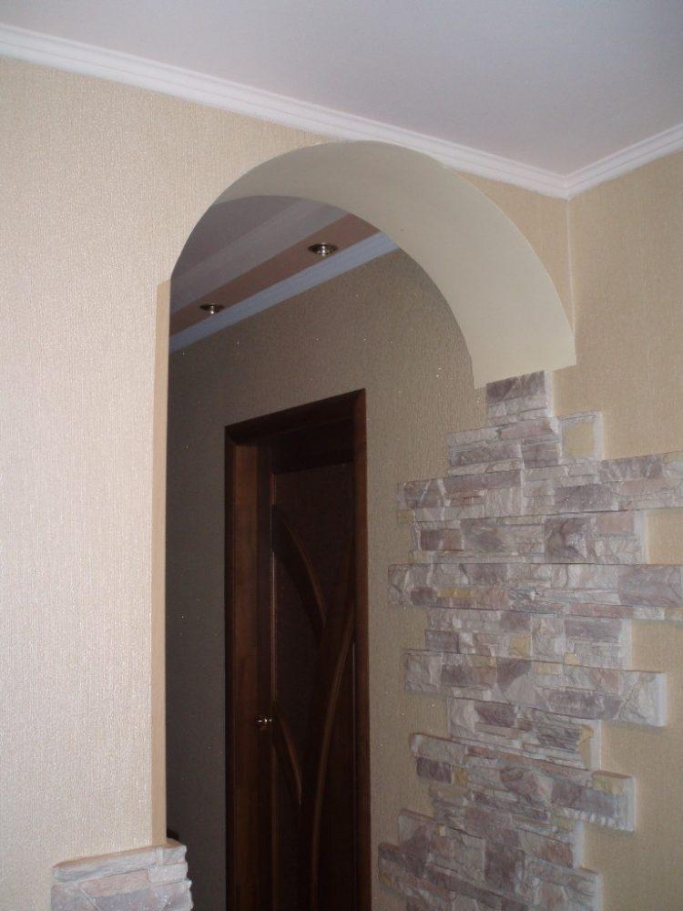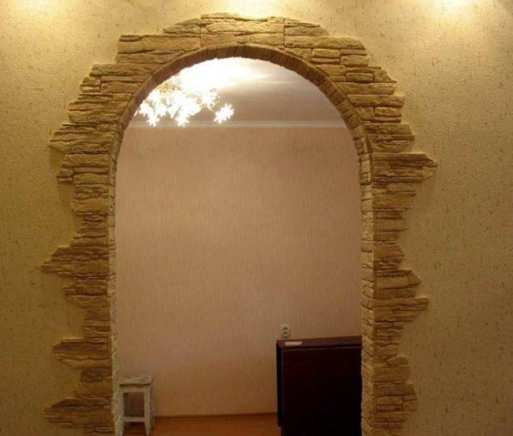 Cualquier puerta de la casa se puede decorar con un arco redondo, cuadrado o cualquier otro arco beige hecho de paneles de yeso. Este color es universal, mientras que en el arco puede hacer huecos que servirán como estantes.