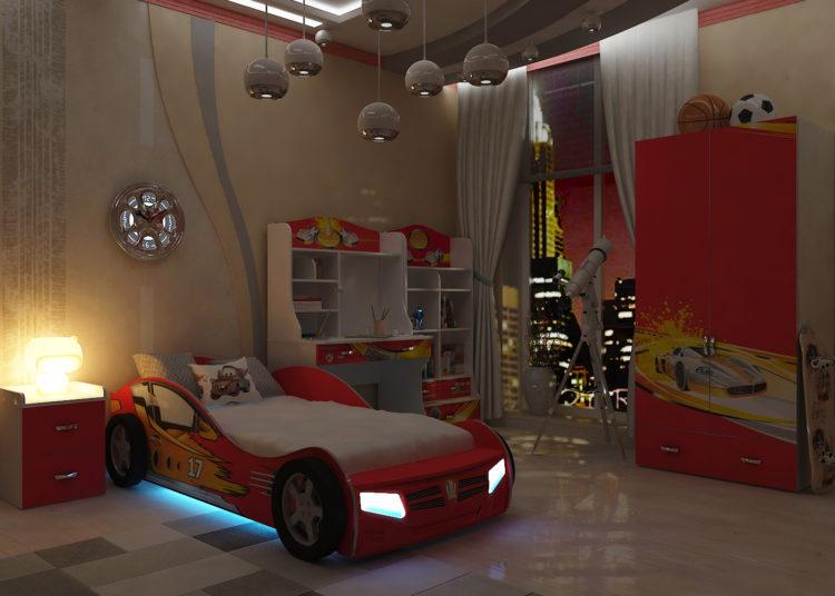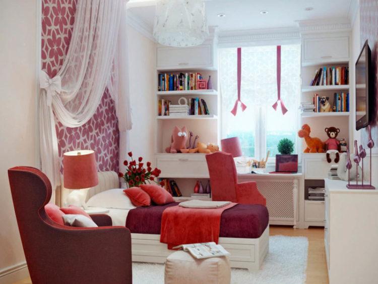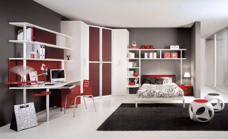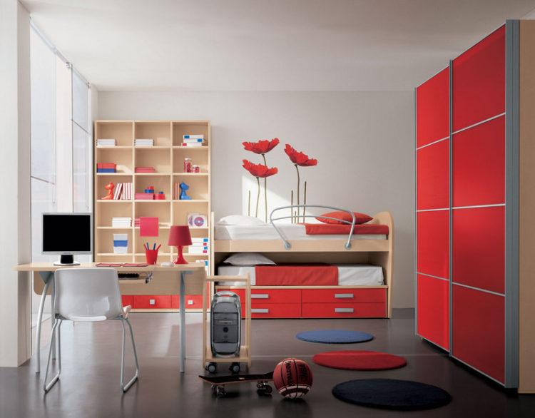 Los muebles infantiles para dos niños en rojo son una buena idea si toda la habitación está hecha en colores oscuros. Una habitación infantil para dos niños en rojo se verá especialmente hermosa si hay un sofá negro y un armario.