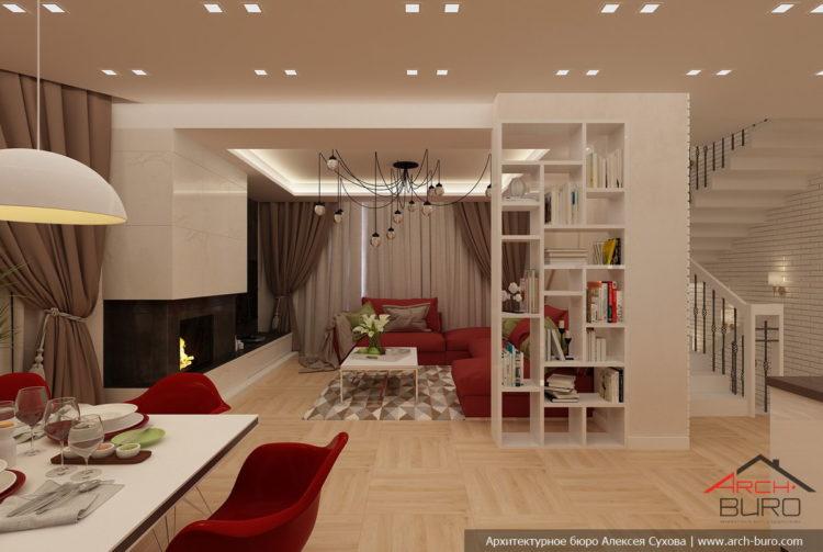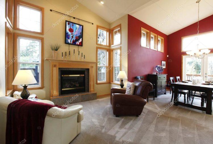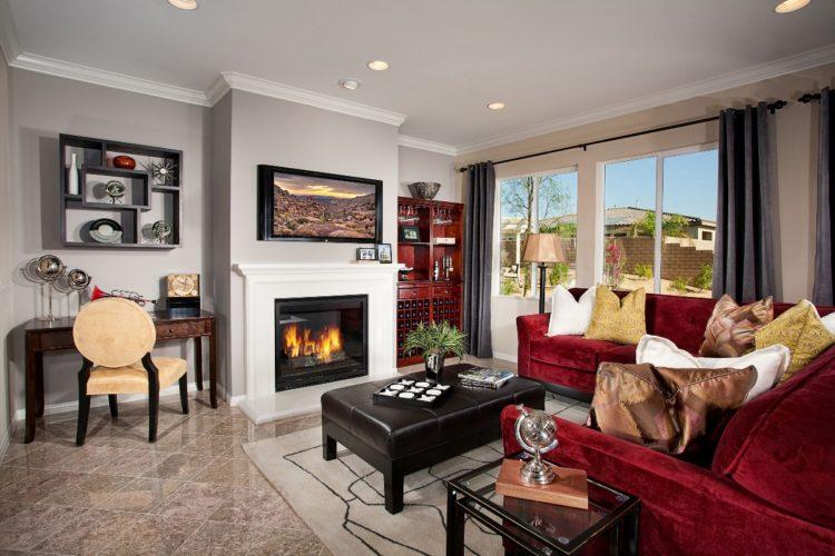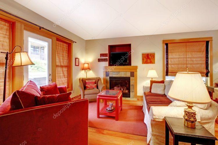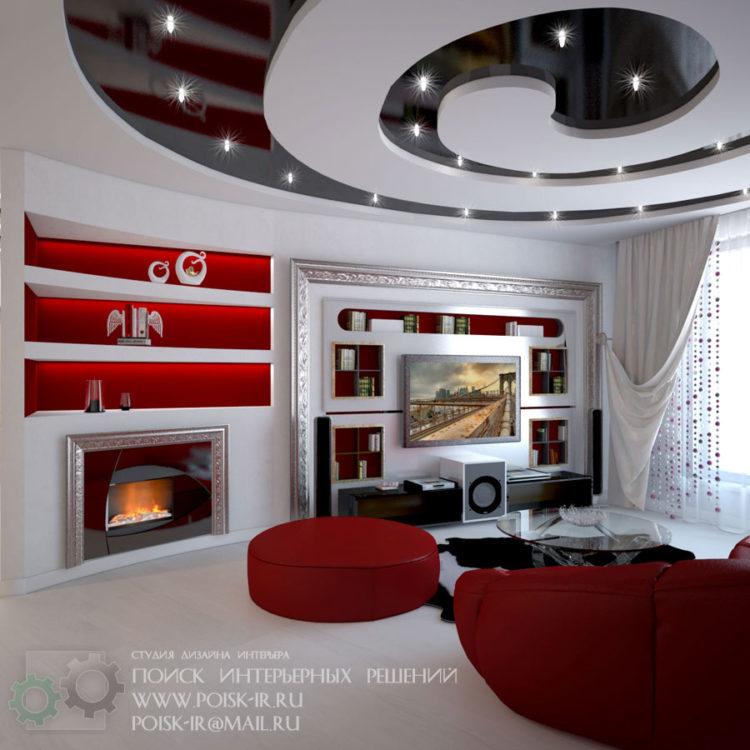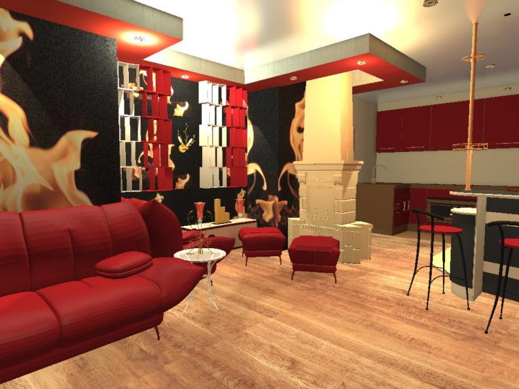 El diseño en rojo siempre es atrevido y desafiante. Las salas de estar con una chimenea de tales sombras son elegidas por personas que no tienen miedo de experimentar.