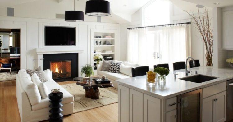 La cocina de la sala de estar con chimenea en un estilo moderno y oscuro siempre se ve sofisticada y es adecuada para los amantes de los clásicos sobrios.