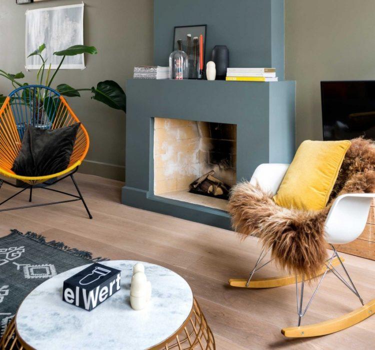 La chimenea verde en la sala de estar crea una atmósfera de tranquilidad, tranquilidad y ligereza.