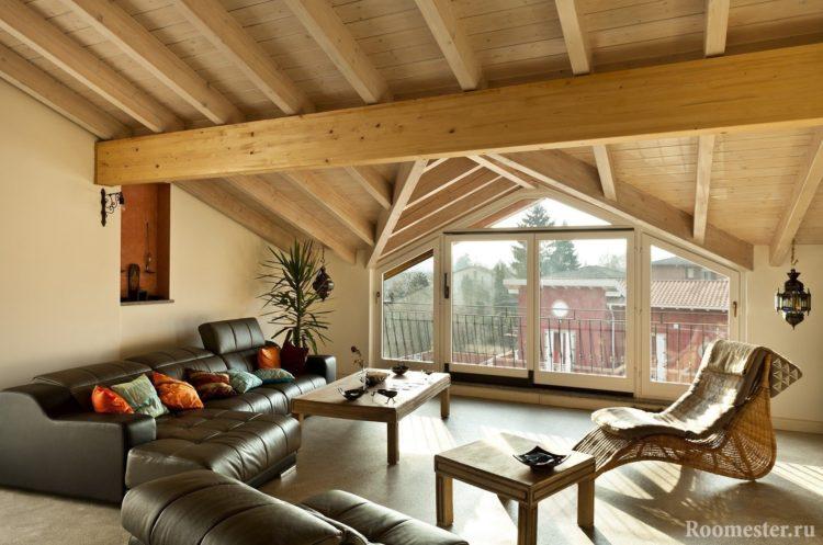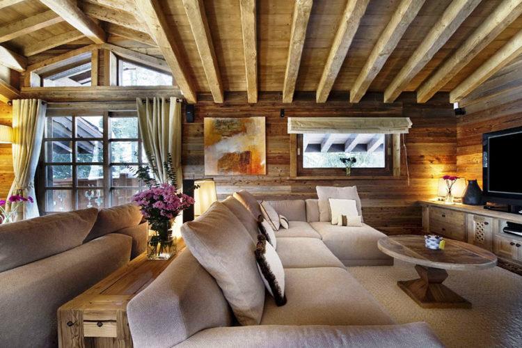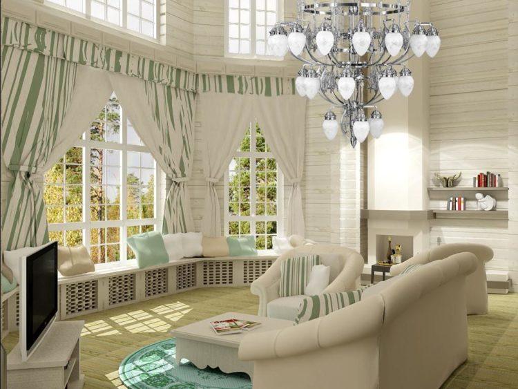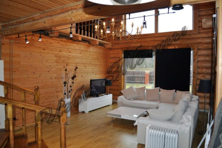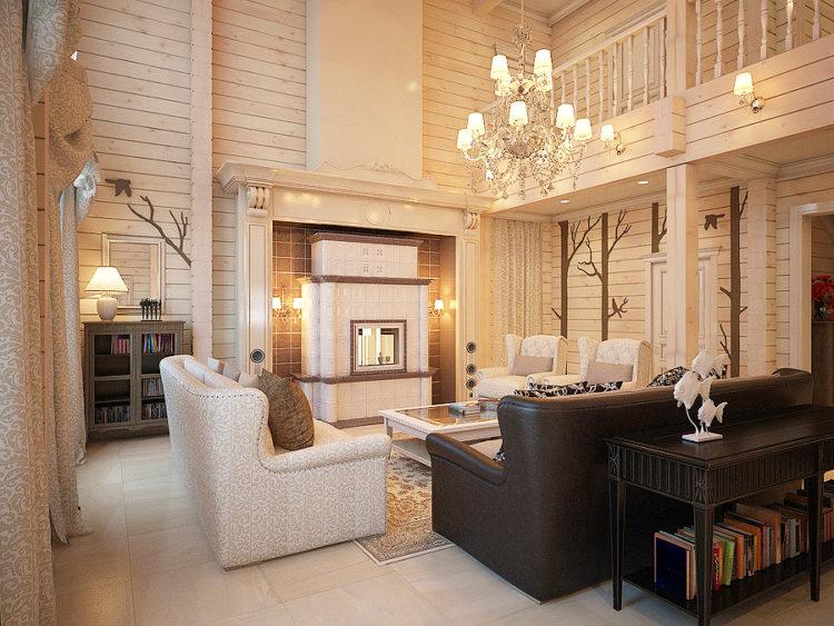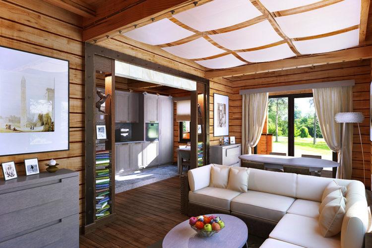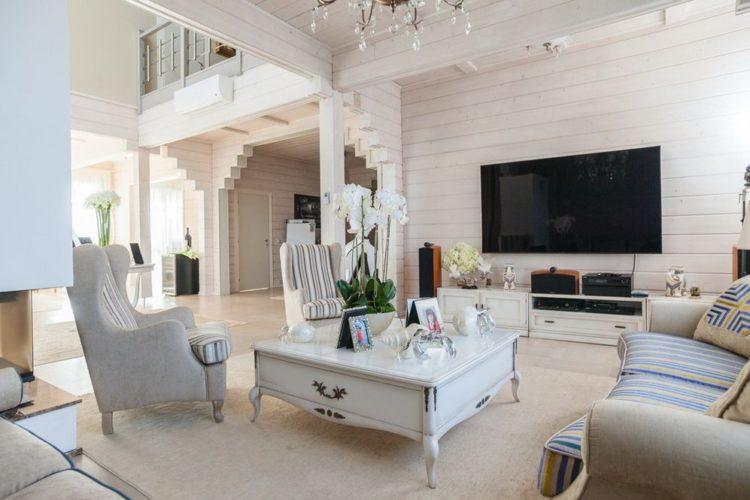La sala de estar en una casa de madera puede demostrar la sofisticación del gusto de los propietarios, si blanqueas el árbol, manteniendo su estructura leñosa. El techo blanco y los muebles claros o blancos en el estilo apropiado harán que la habitación sea increíblemente luminosa, acogedora y moderna.