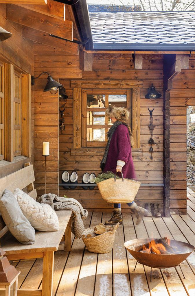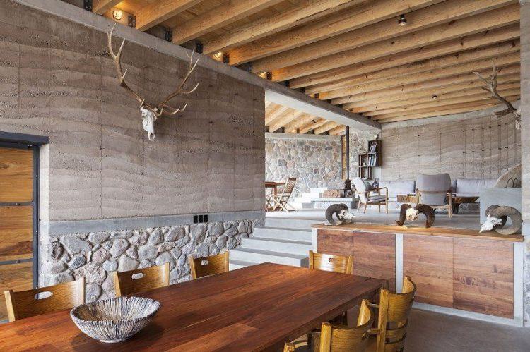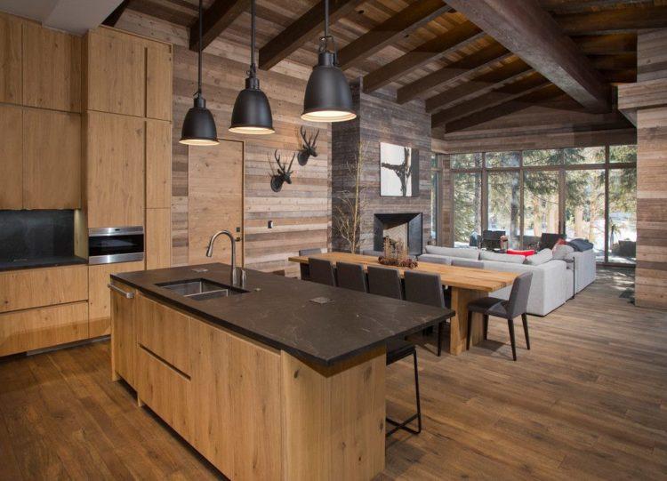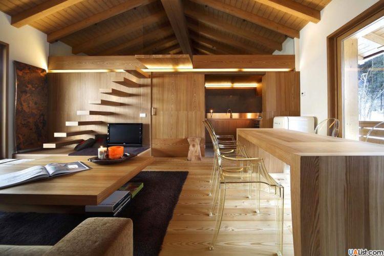 Si busca un diseño elegante de una casa de madera desde un bar en el interior, una foto de un espectacular estilo de chalet lo satisfará: vigas abiertas, madera oscura, molduras de piedra en bruto, escaleras y luz tenue.