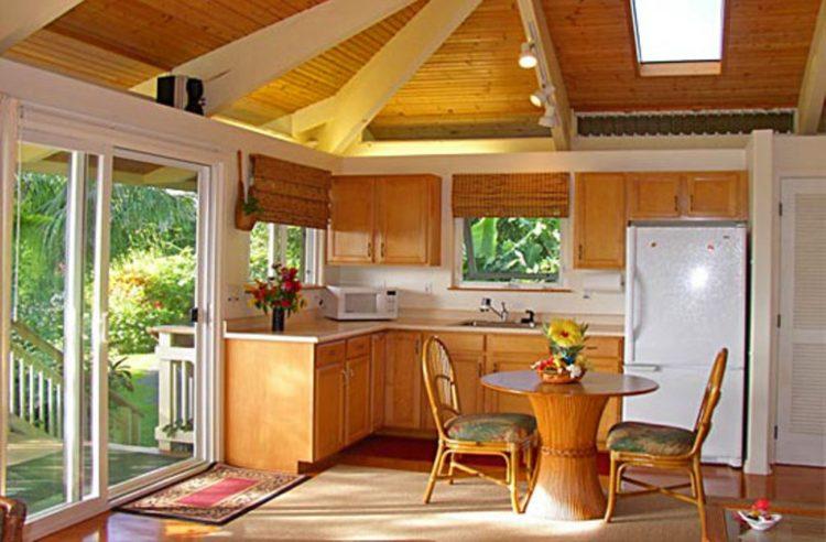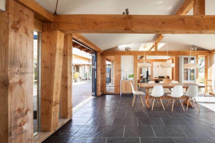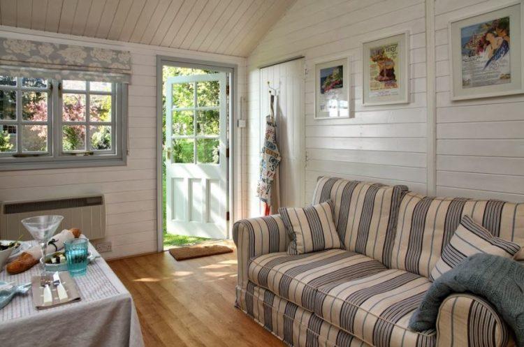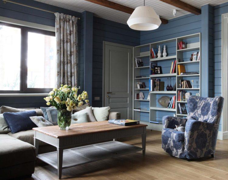 El interior de una casa de madera se puede diversificar pintando las puertas en un rico color azul: contrastarán efectivamente con tonos de madera tranquilos.