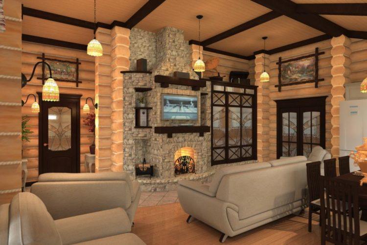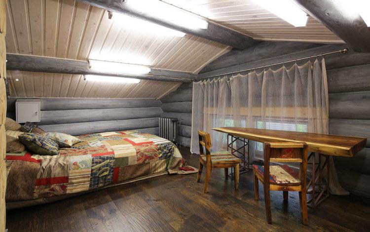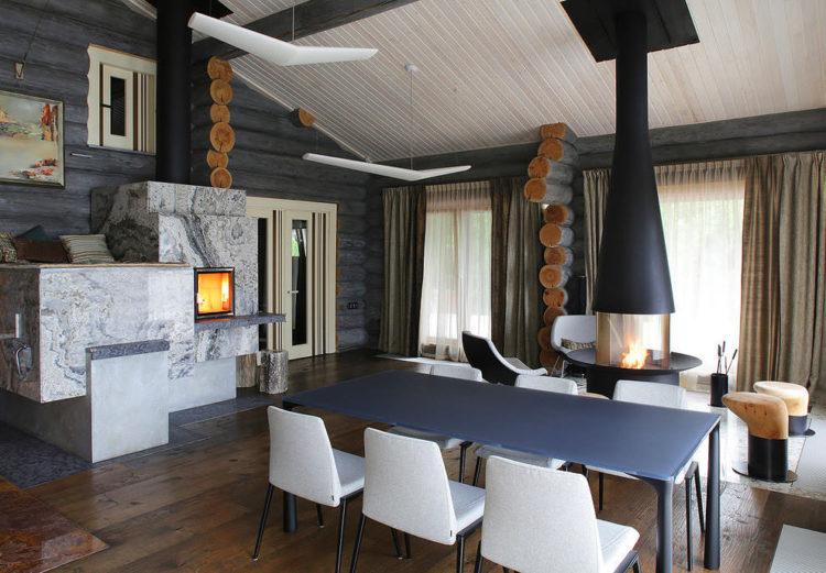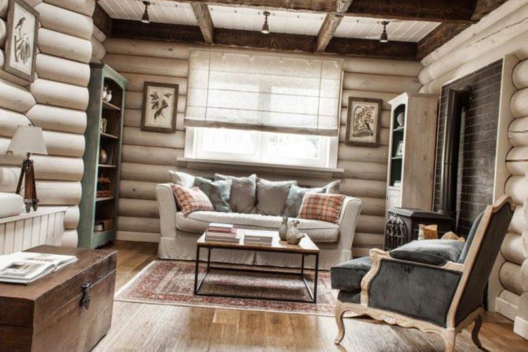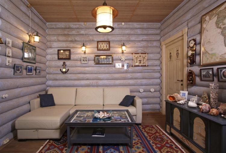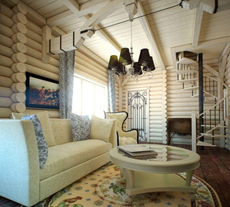El color gris de los tonos claros ayudará a enriquecer el interior de una casa de madera a partir de un tronco en el interior (se presenta una foto de teñir las paredes de los troncos para mayor claridad): esto llenará inmediatamente el espacio con frescura y luz.