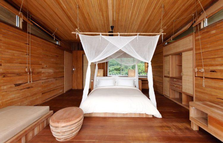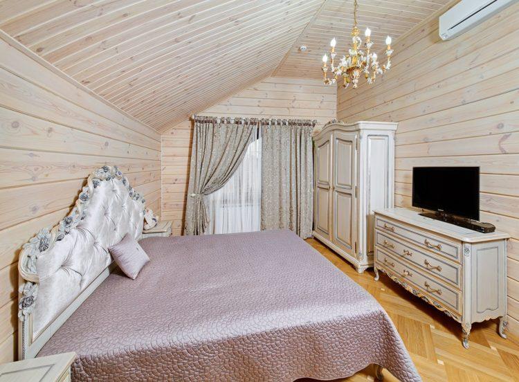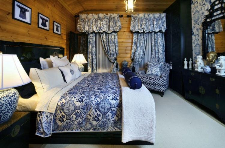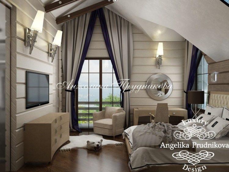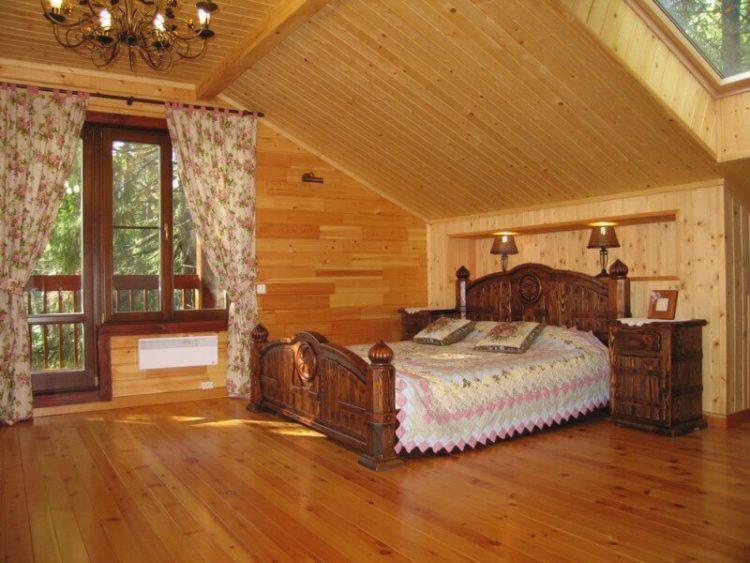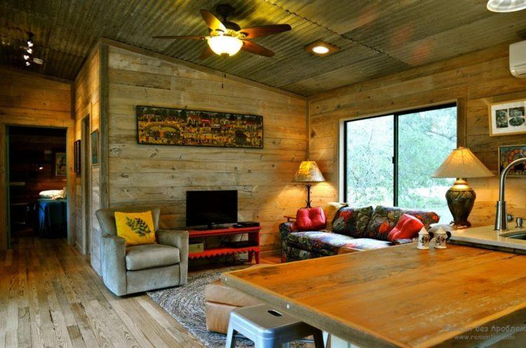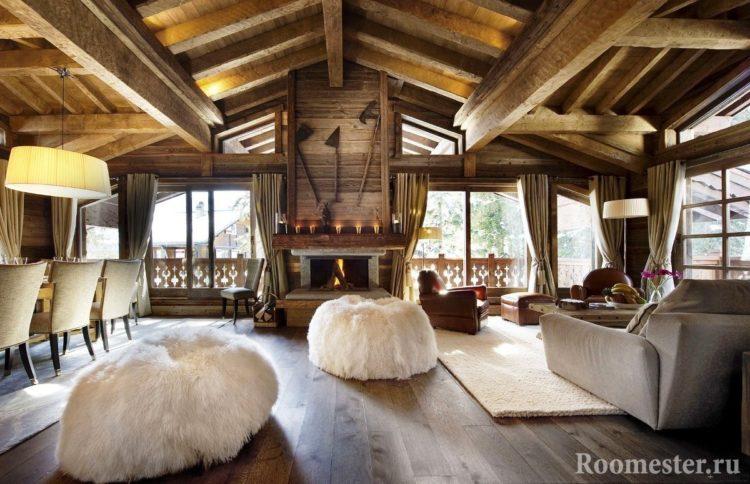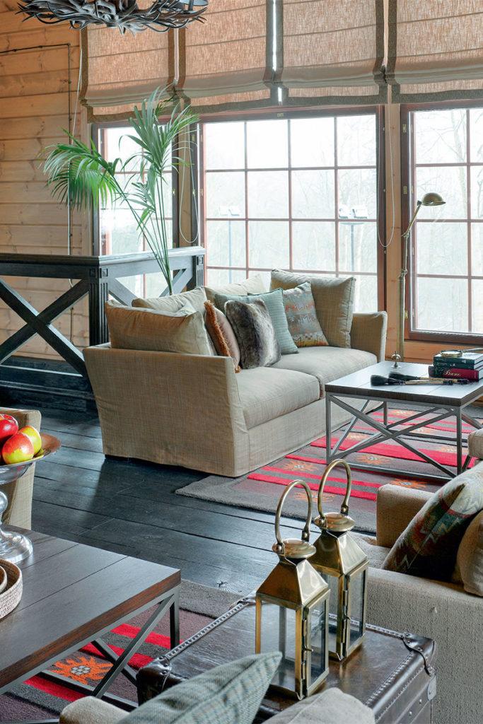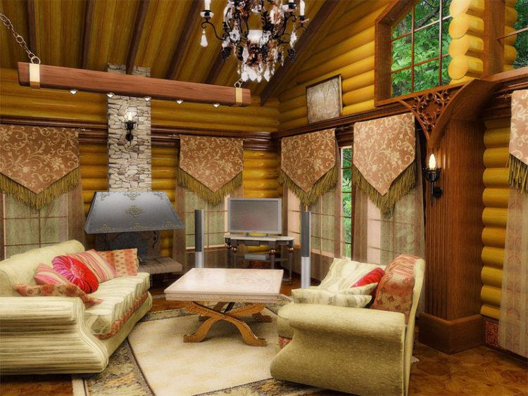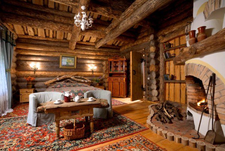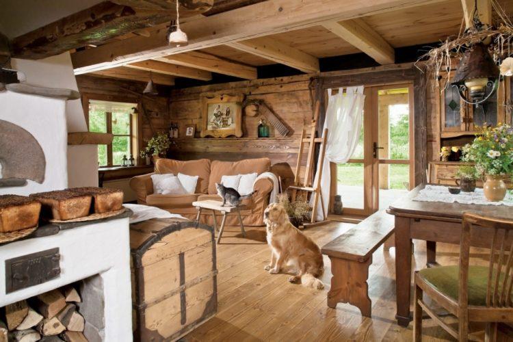 Al elegir el interior de una casa tranquila desde un interior de madera, cuya foto se distingue por un estilo étnico pronunciado, preste atención a los tonos naturales para las paredes, el piso y el techo. Los detalles discretos (alfombras, colchas y más) se convertirán en decoraciones.