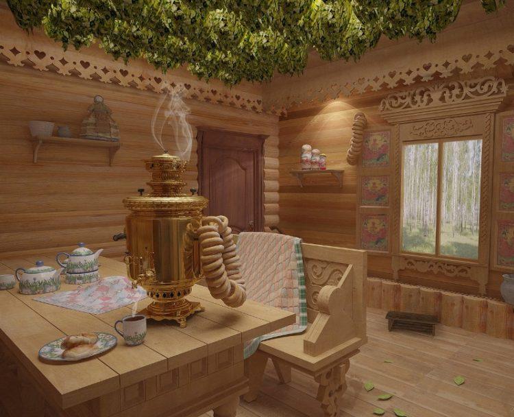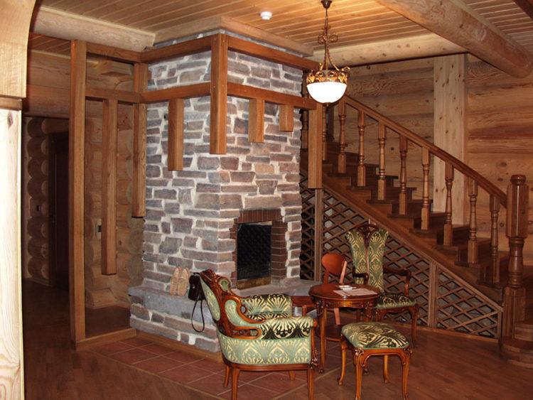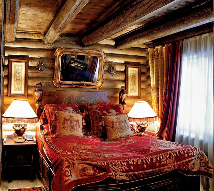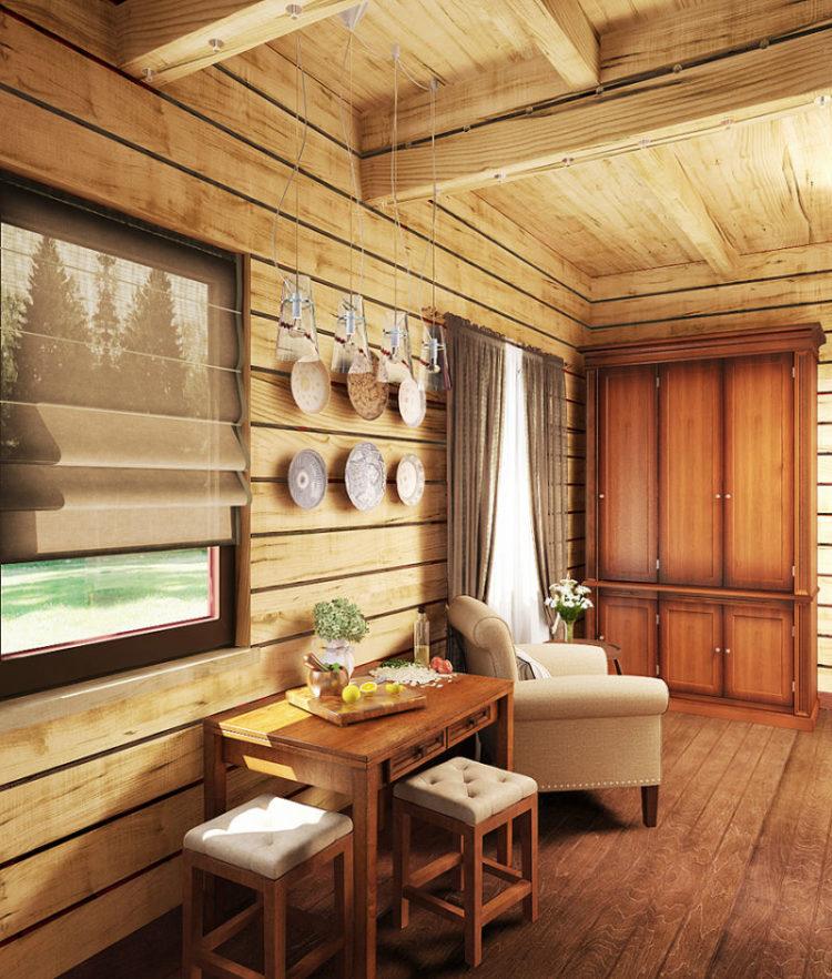La decoración interior de una casa de madera resultará elegante y original, si algunos de los elementos interiores contra el fondo general de las paredes de madera se hacen brillantes y llamativos, por ejemplo, rojo. Pueden ser detalles muy pequeños: pantalla de lámpara, una tira delgada en la chimenea y otros objetos.