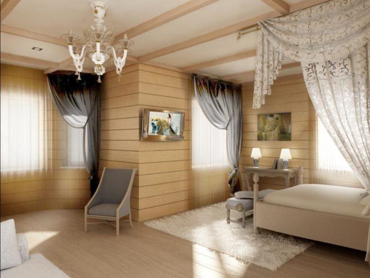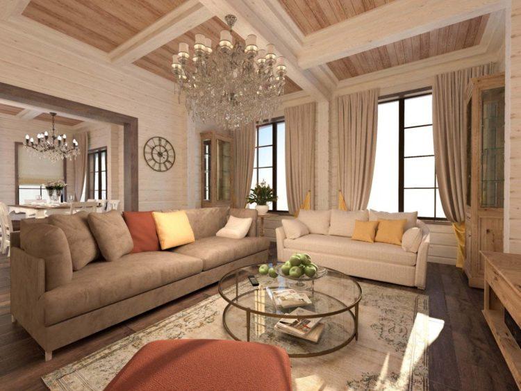 Si prefiere que la decoración de una casa de madera en el interior (fotos de combinaciones armoniosas para comparación) sea tranquila, pero no monofónica, es posible combinar dos o más colores en una habitación. Si el diseño proporciona una habitación de madera, entonces sería razonable combinar tonos claros de madera con tonos marrones del piso y los muebles, otras habitaciones pueden mostrar otros colores.