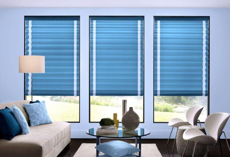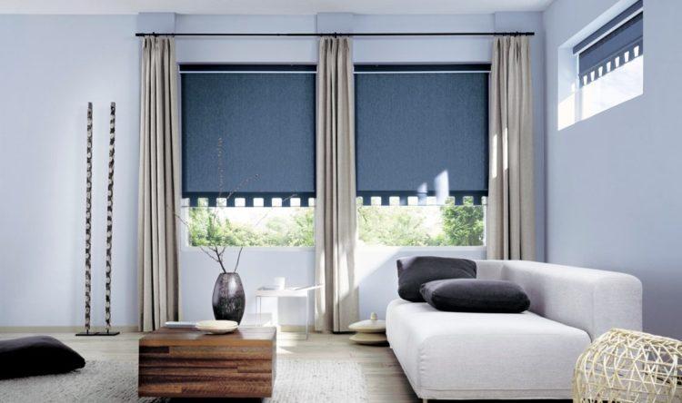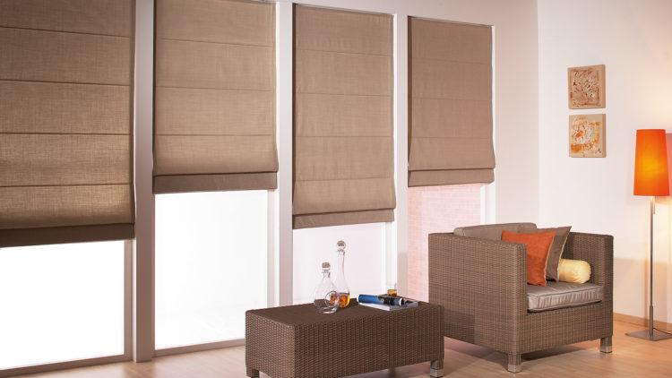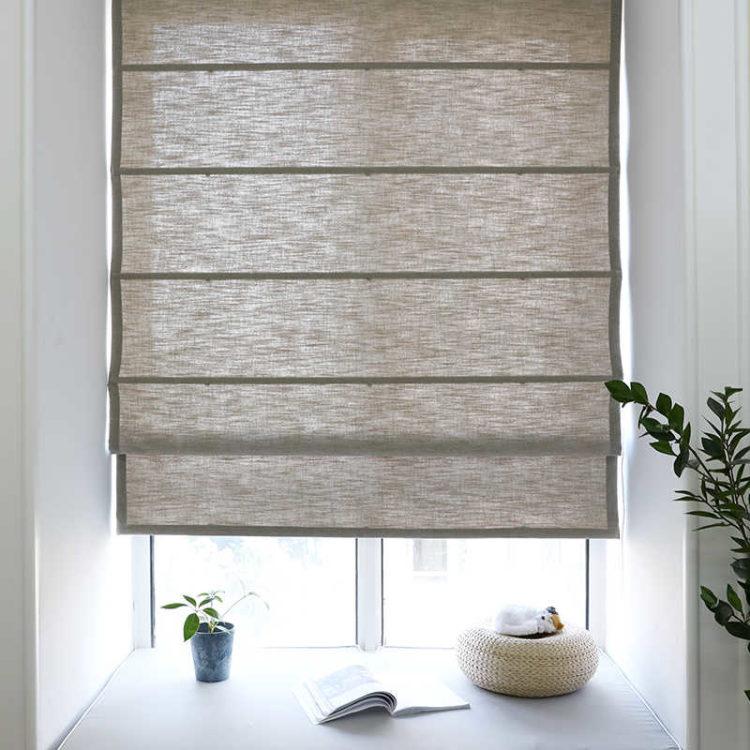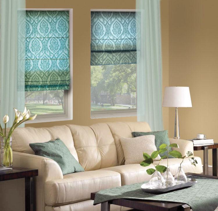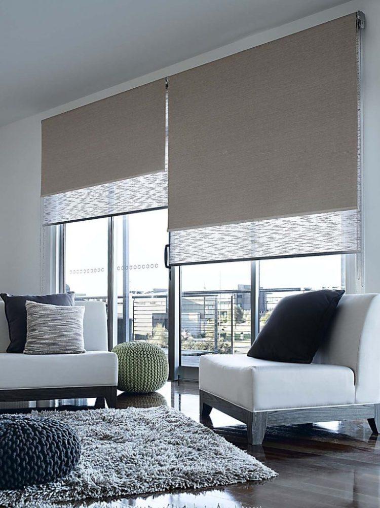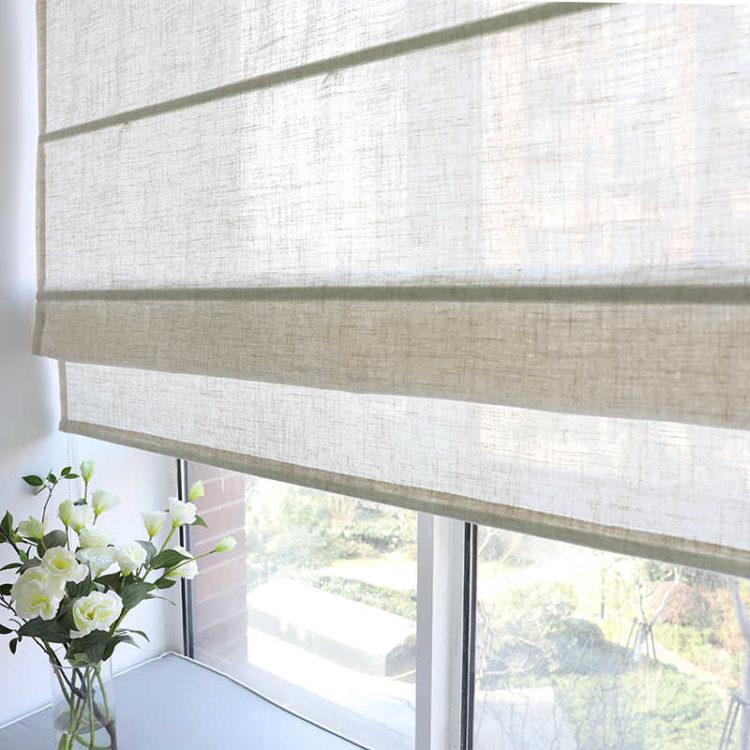 - Cortinas romanas beige en las ventanas de la sala de estar