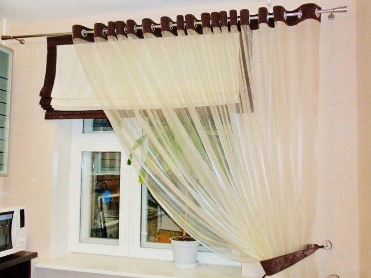 Al elegir cortinas en las que prevalece una clase alta de tela, puede colocarlas en la cocina. Las versiones blancas de los diseños romanos con tul corto se ven geniales en este caso.