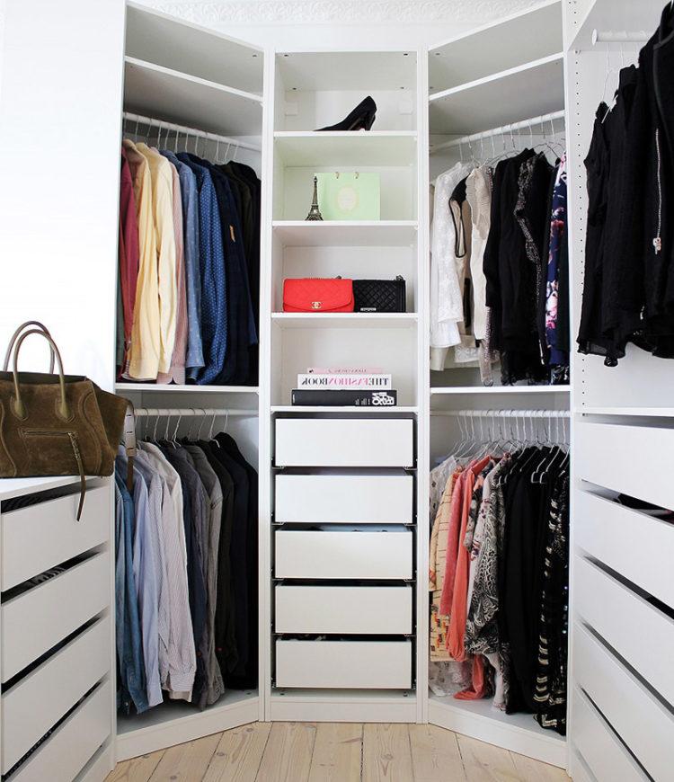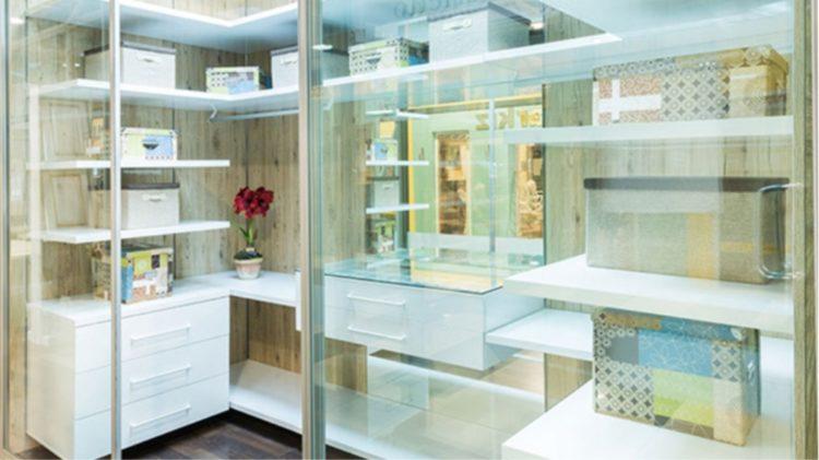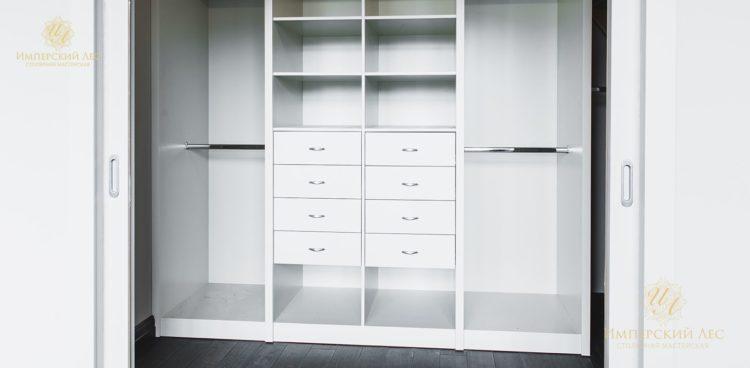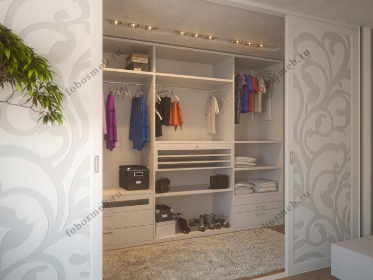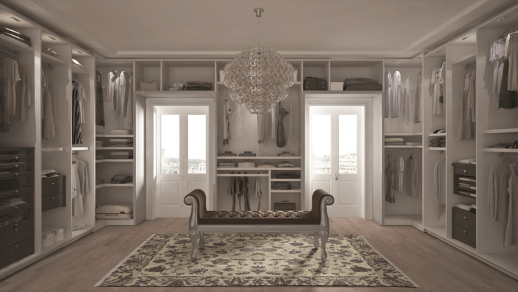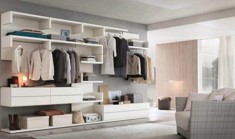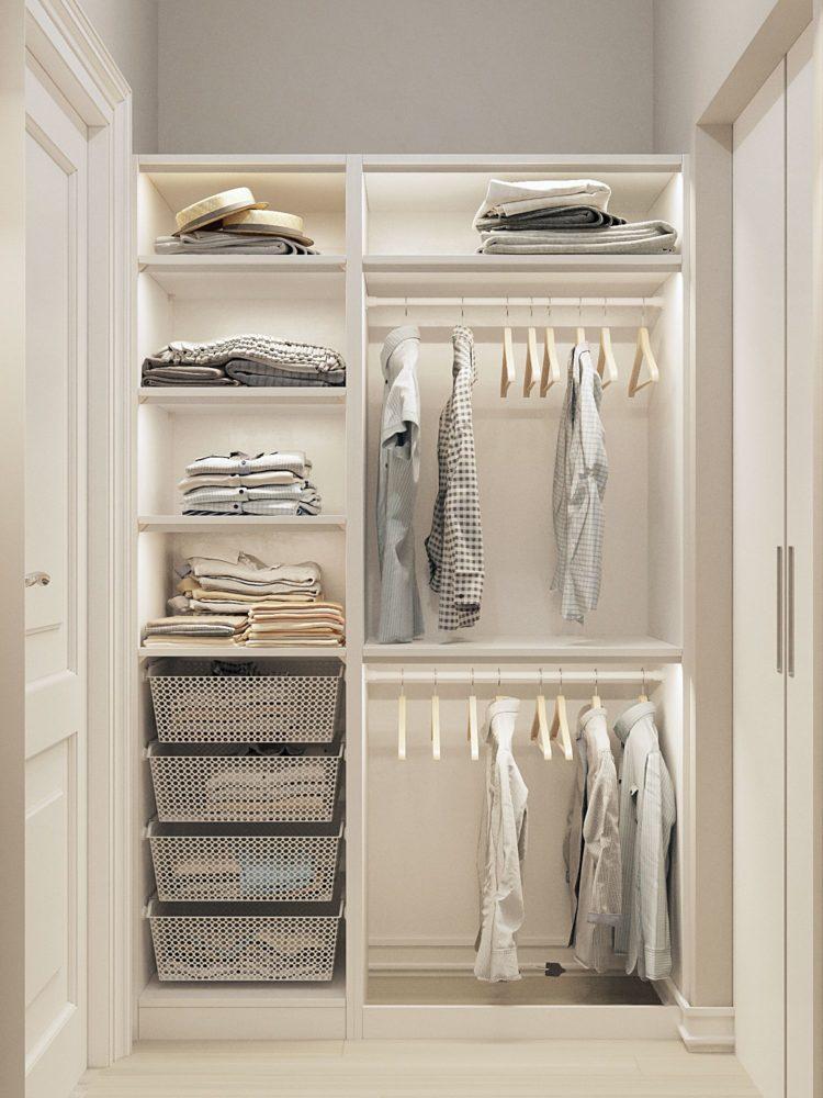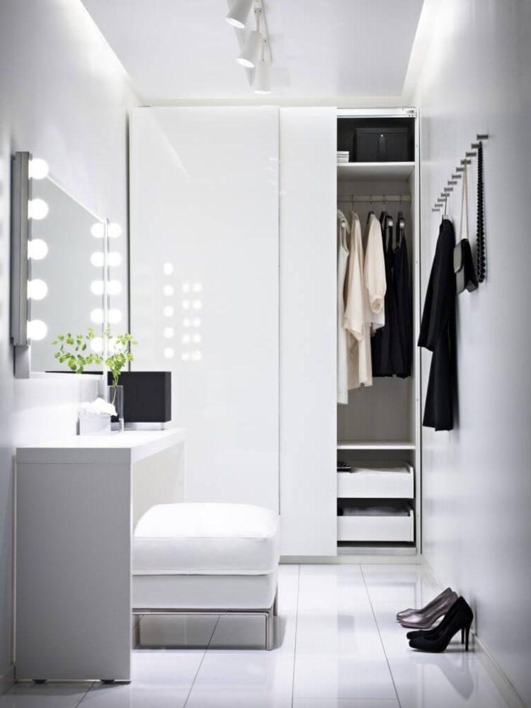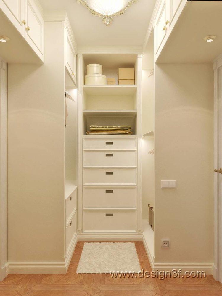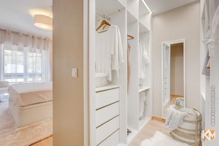 El diseño blanco de los vestidores, para los que se utiliza el pasillo o la sala de estar, ayuda a convertir el pequeño tamaño de la habitación en un espacio aéreo brillante.