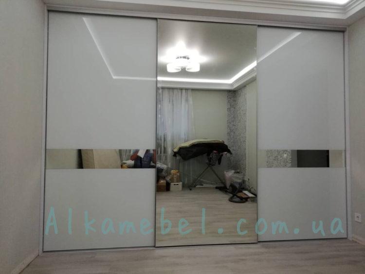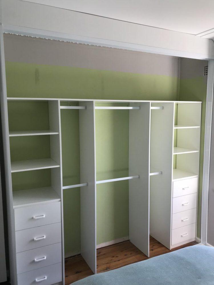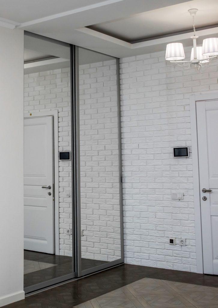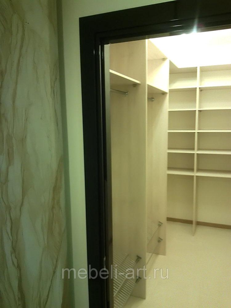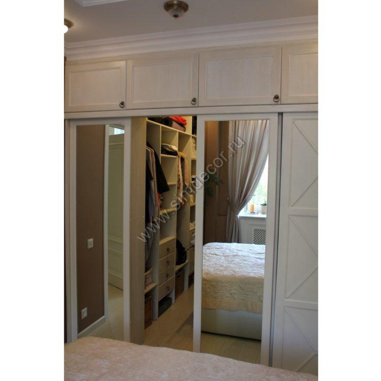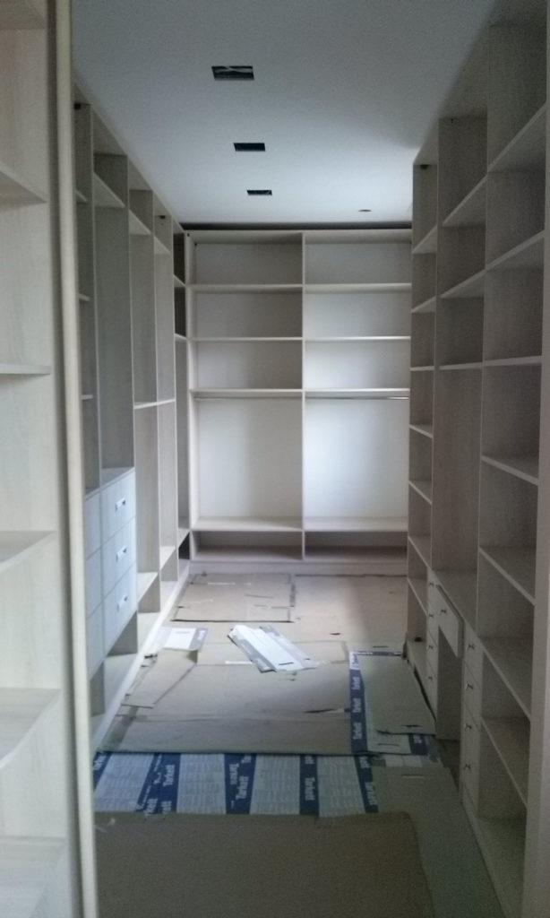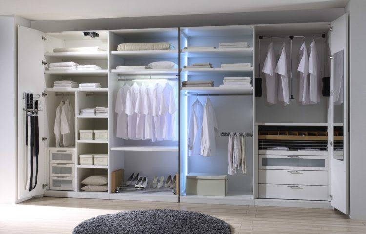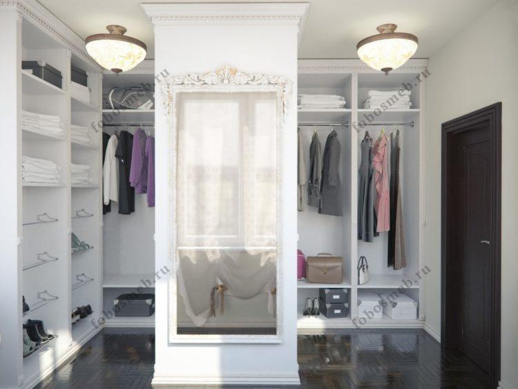 El diseño blanco de los vestidores, para los que se utiliza el pasillo o la sala de estar, ayuda a convertir el pequeño tamaño de la habitación en un espacio aéreo brillante.