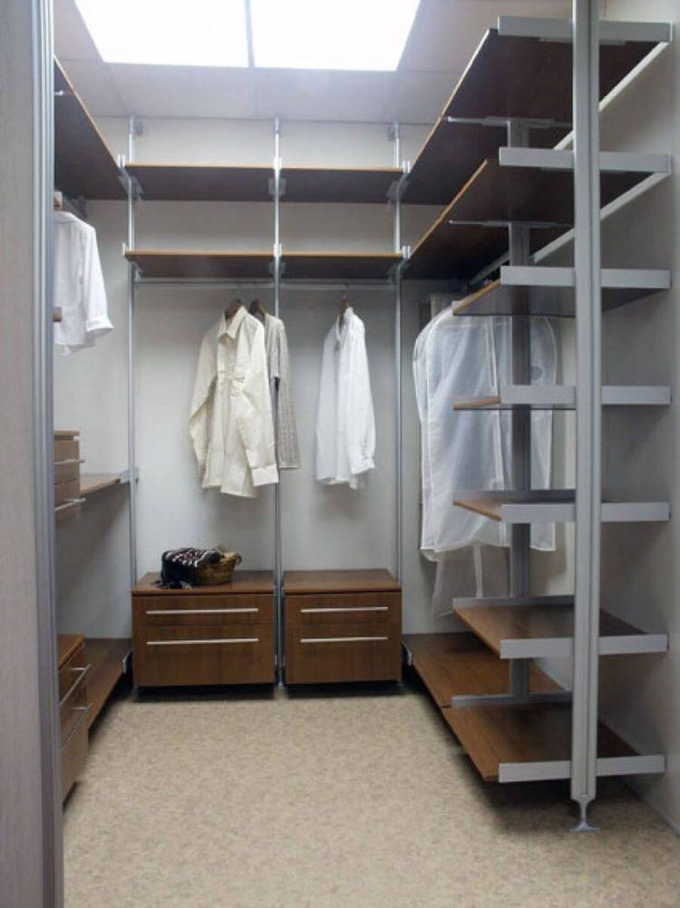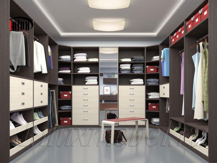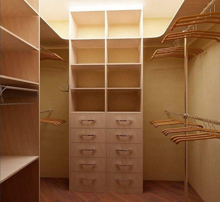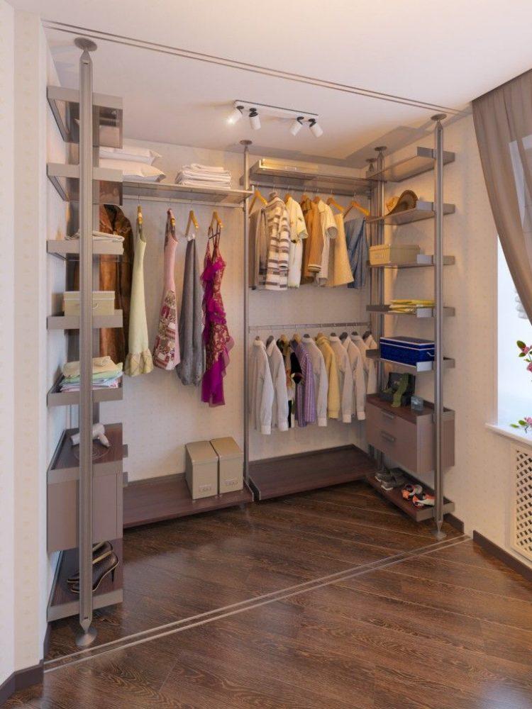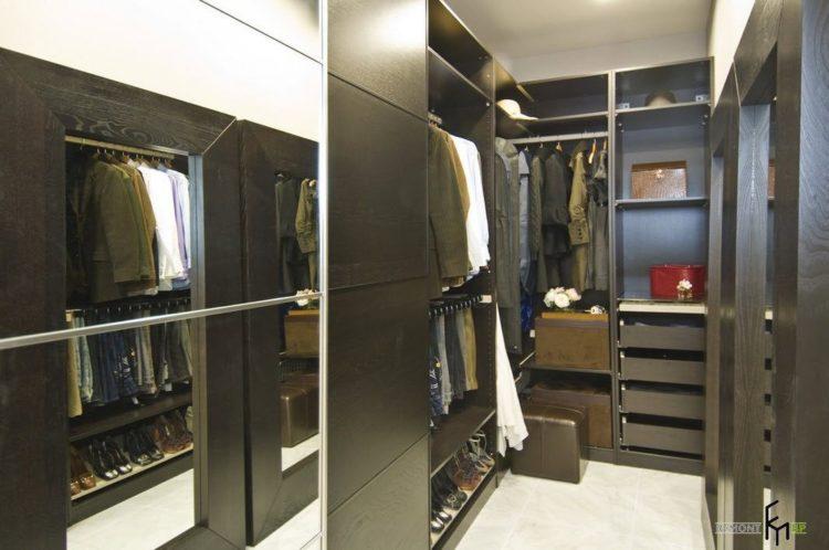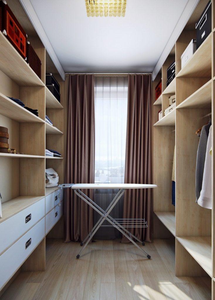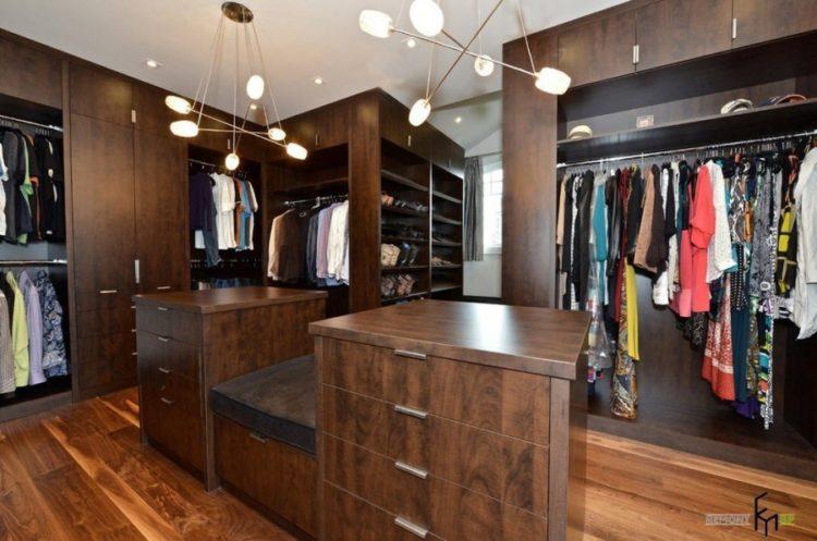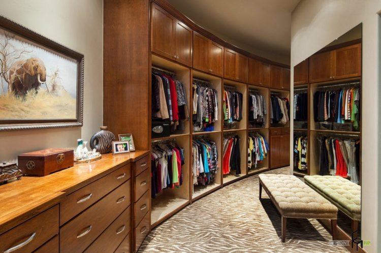 Una sala de armario rectangular, cuyo diseño está hecho en la solución estilística general de todo el apartamento, puede acomodar la cantidad requerida de estantes y gabinetes. Hay pequeños armarios, cuyo diseño demuestra que incluso un espacio pequeño ayudará a almacenar cosas en él. Para aquellos cuyo diseño de apartamentos no permite asignar una habitación, existe la posibilidad de crear un mini armario con sus propias manos, que encierra un par de metros de la habitación o sala de estar.