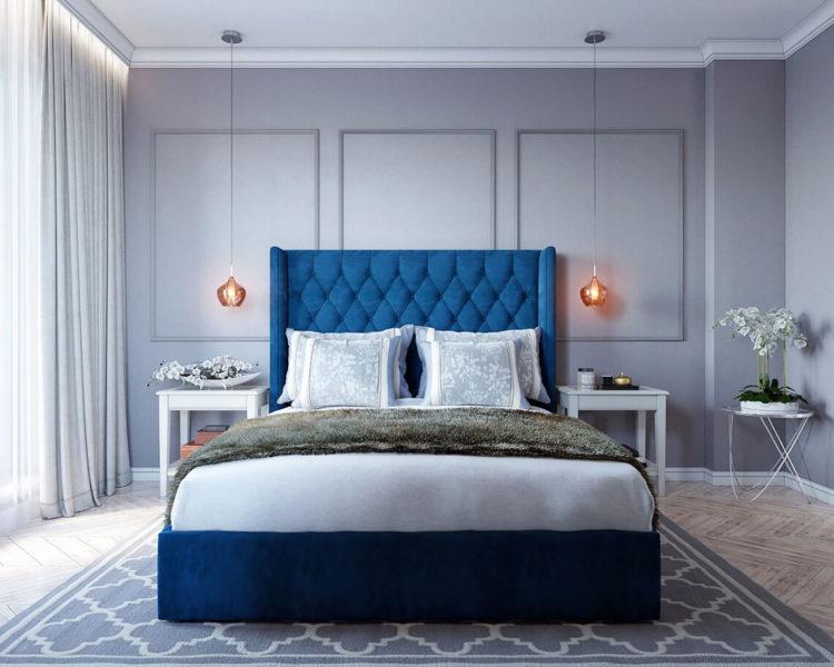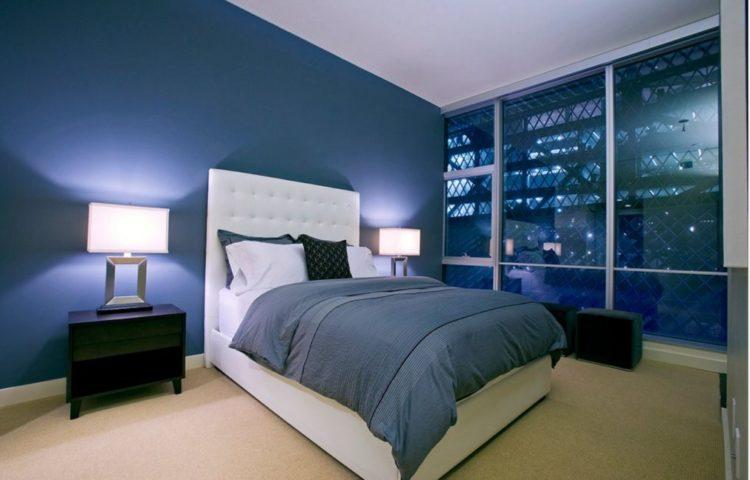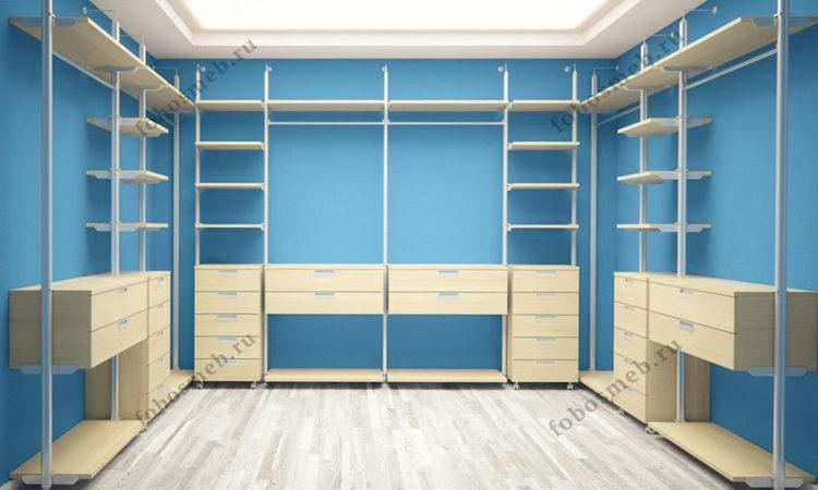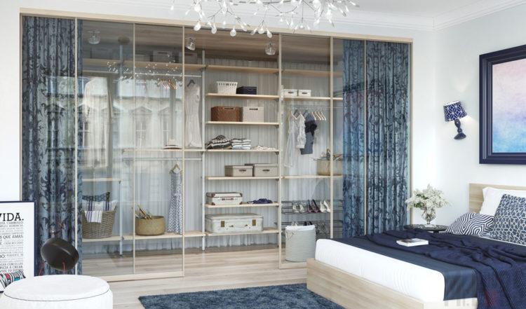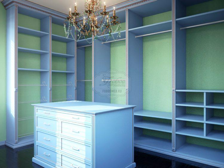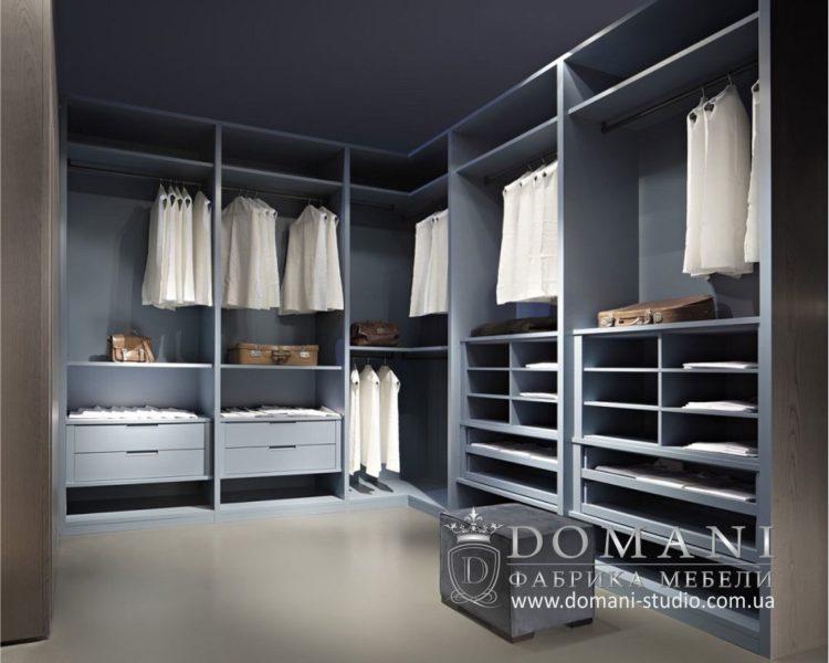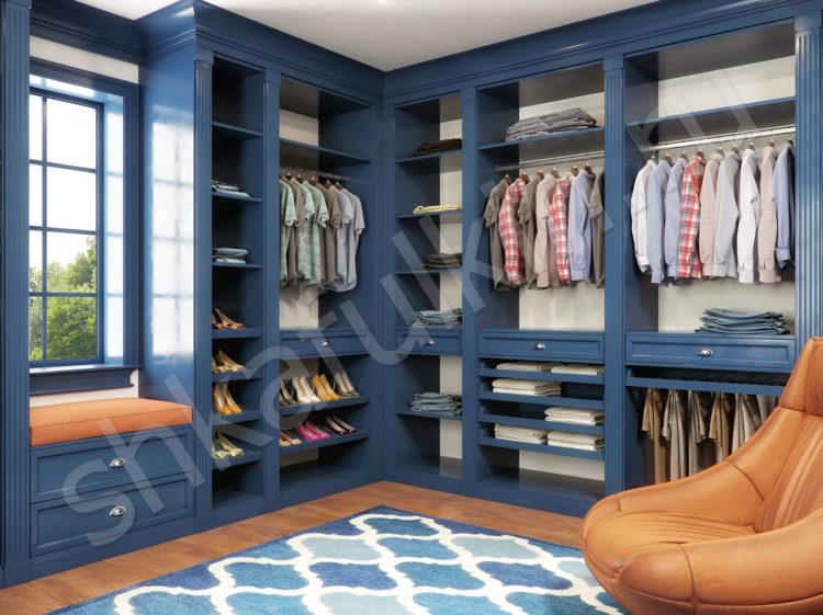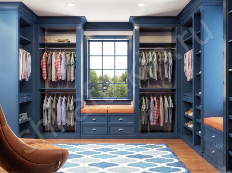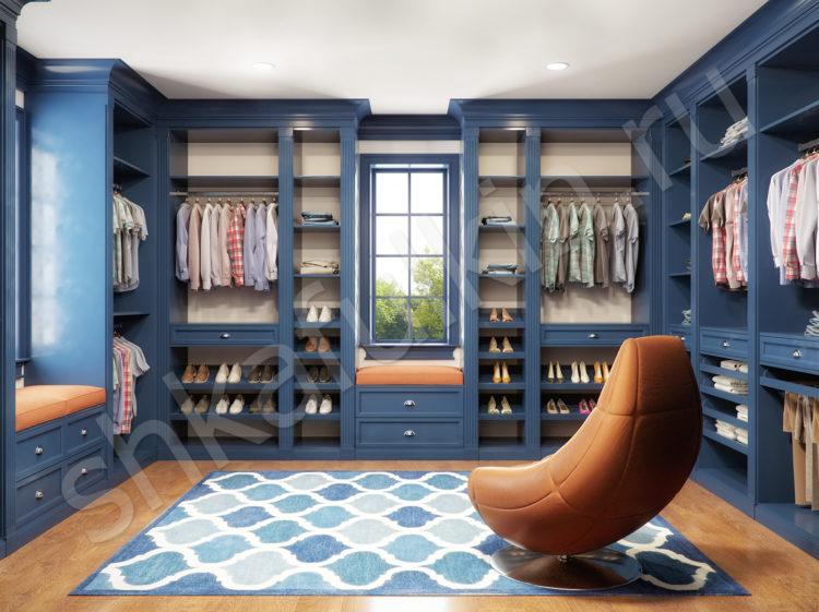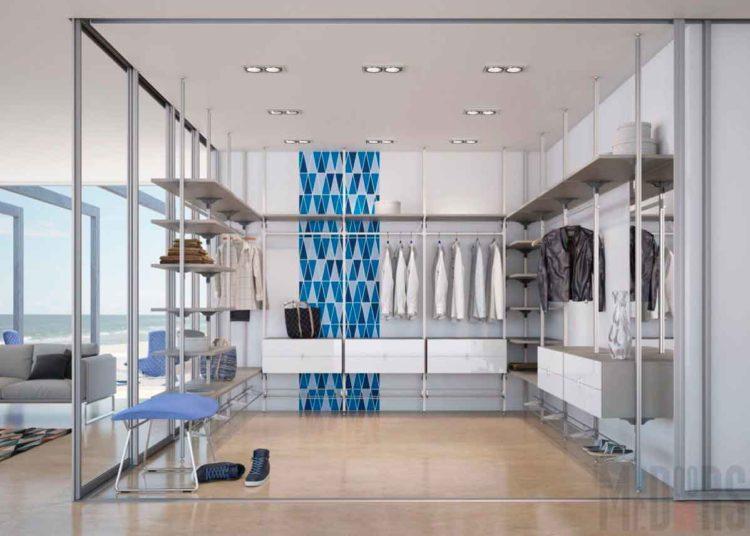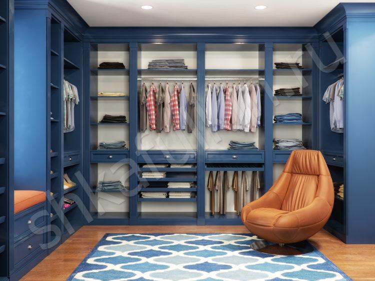 El estricto interior azul del vestidor de 3 metros cuadrados es el más adecuado para los hombres que aprecian el orden en la casa y siguen la última moda.