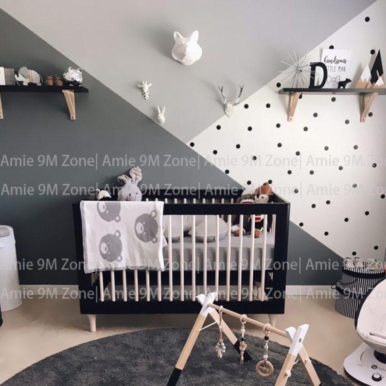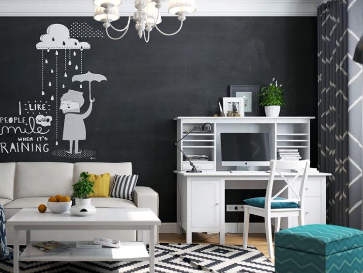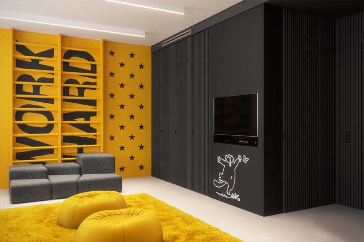 La sala de estar y la guardería en la misma habitación, decoradas en negro, parecen bastante interesantes, pero para los niños es mejor elegir colores brillantes y detalles atractivos.