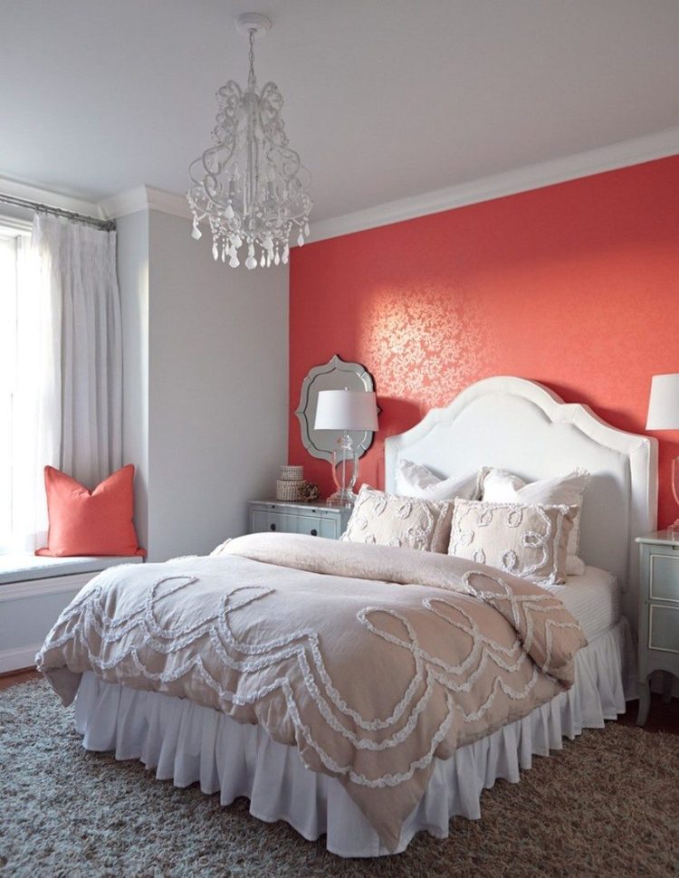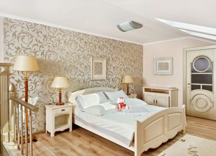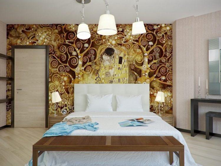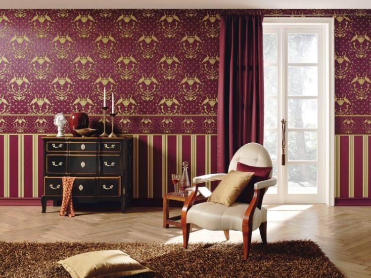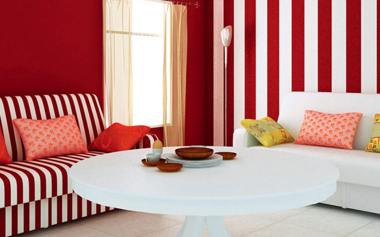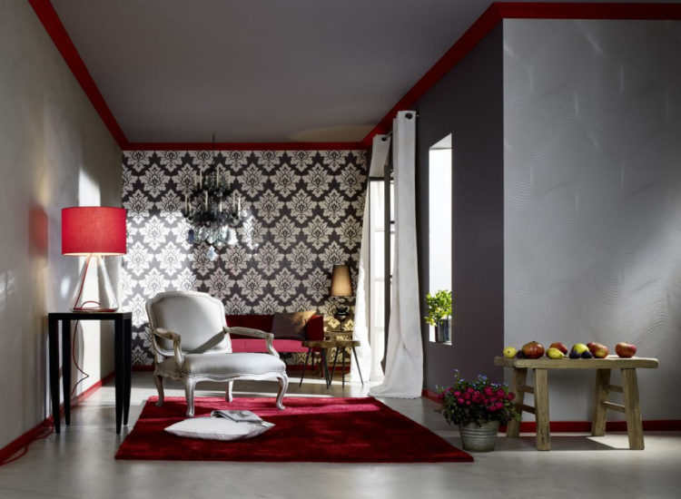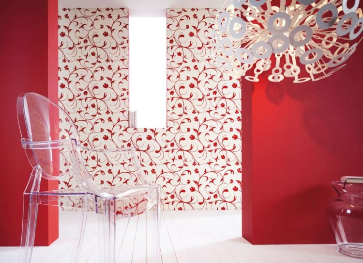 Es deseable decorar la base roja con papel tapiz con elementos de color blanco, beige, amarillo u dorado. Crearán un contraste suave para la formación del entorno deseado en la habitación.