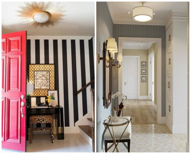 Asumiendo una base gris, dos tipos de papel tapiz en una habitación se mostrarán perfectamente en el pasillo.Este lugar en la casa necesita practicidad, que se proporcionará pegando fondos de pantalla de dos tipos, el diseño de las fotos que estudiará más a fondo.