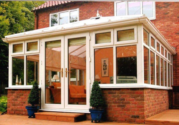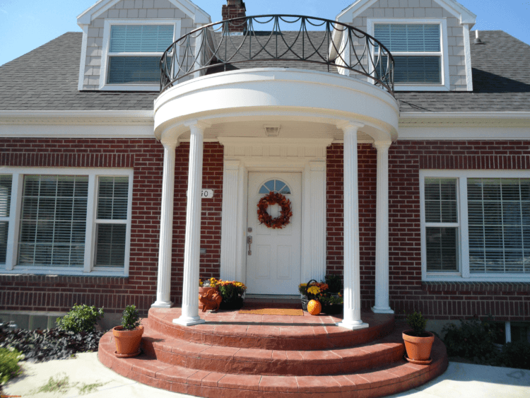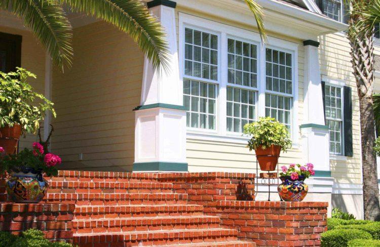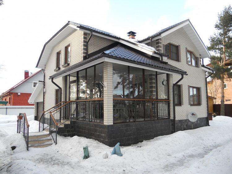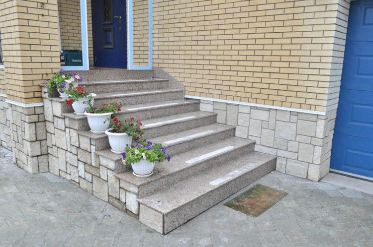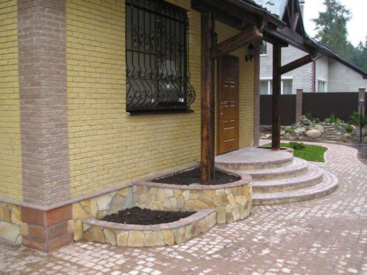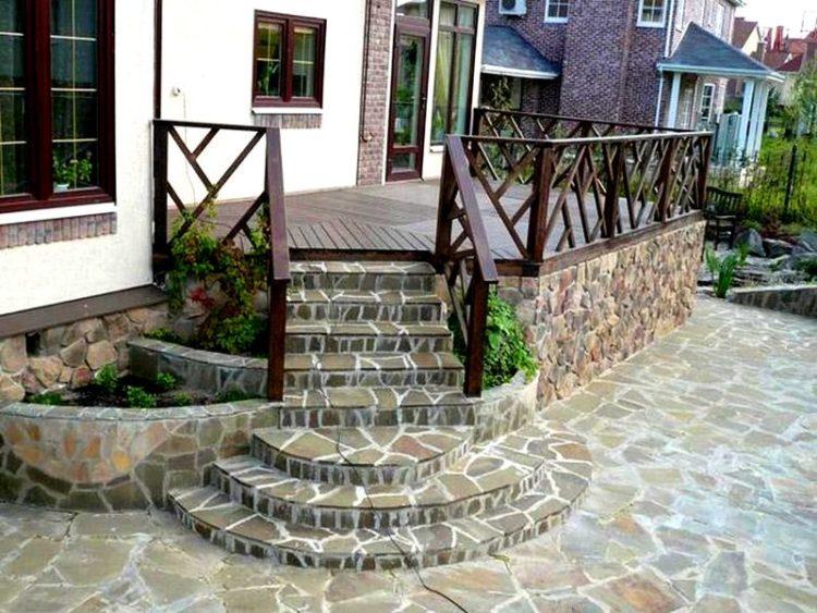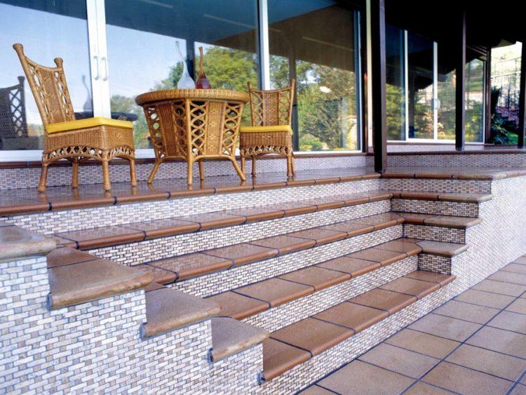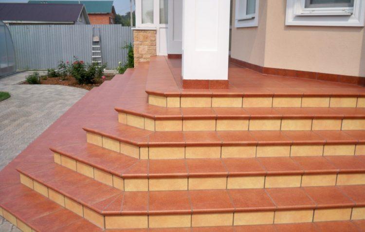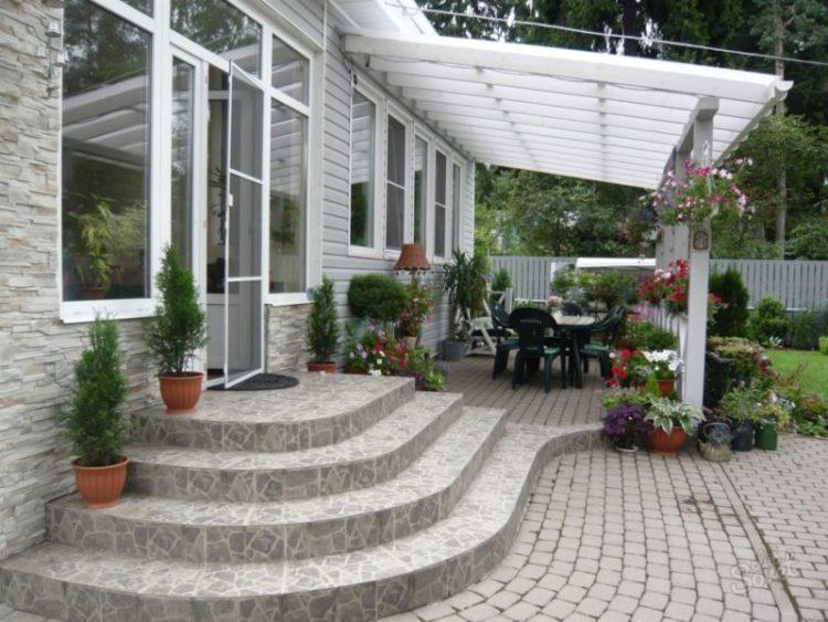 Un hermoso porche en una casa privada (foto a continuación) se verá armoniosamente en color beige. Incluso un porche cerrado para una casa privada (las fotos se adjuntan a continuación) irá bien con escalones beige.