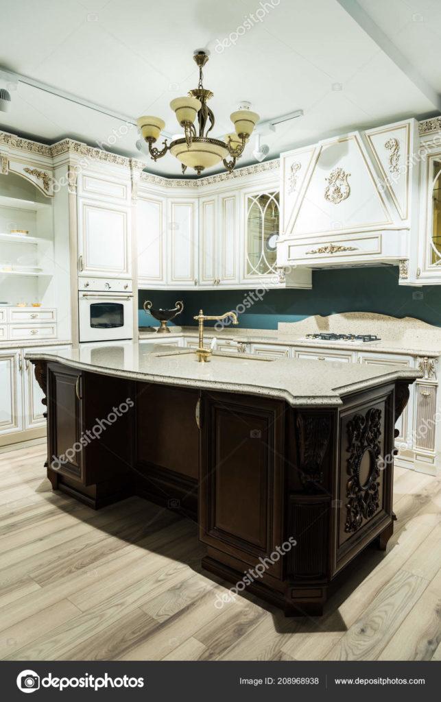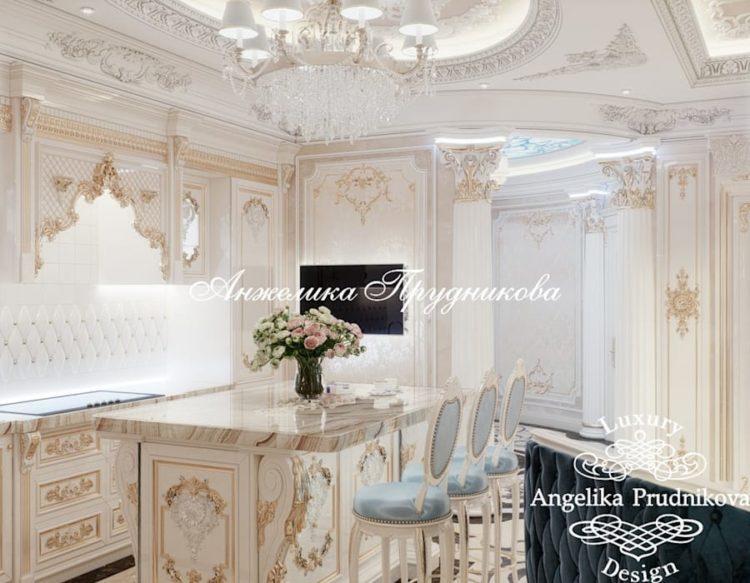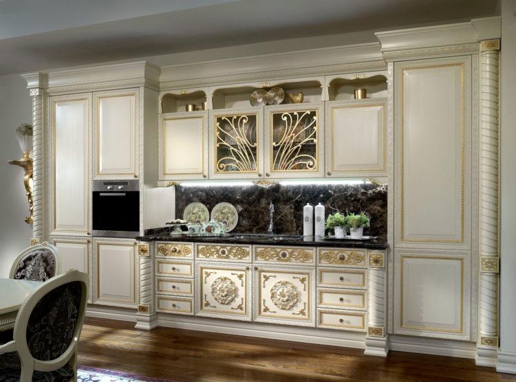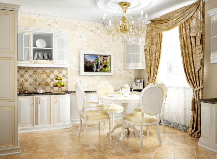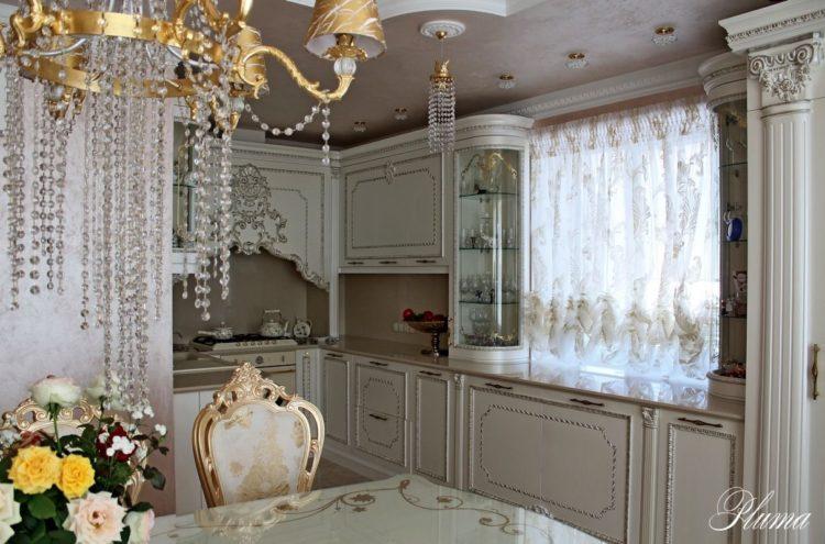 El estilo barroco en el interior de la cocina se ve perfecto en color beige. También en este diseño, le proporcionará practicidad.