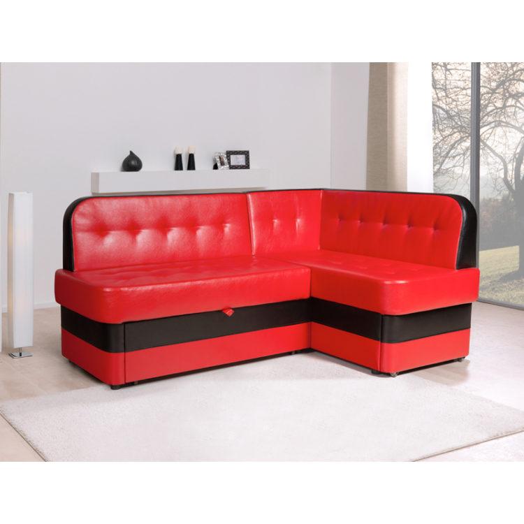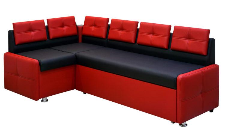 La cocina con un sofá en tonos rojos debe estar decorada en los mismos colores. El fuerte contraste de los muebles y la decoración destruirá la armonía general del interior.