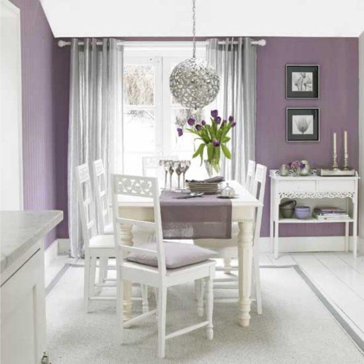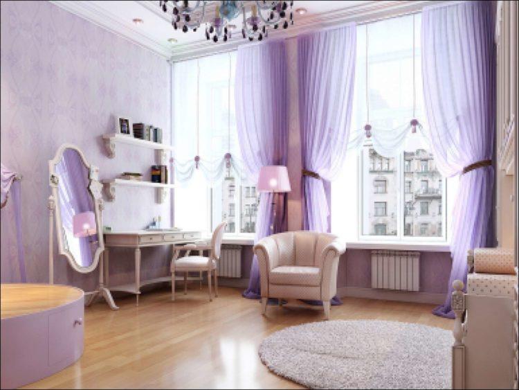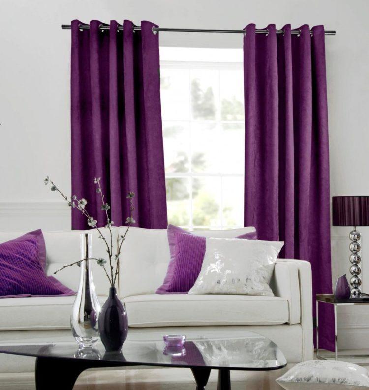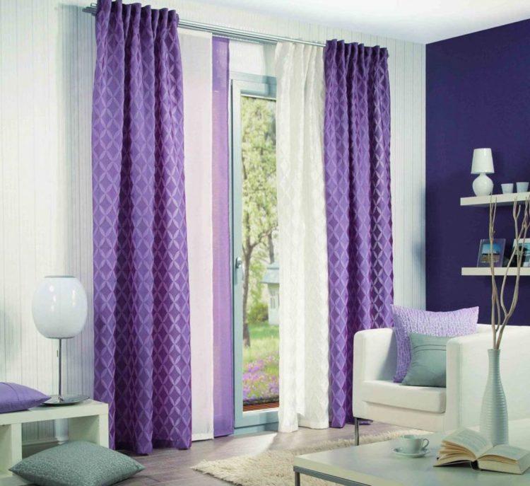 Las cortinas púrpuras van bien con el blanco. Y el blanco puede ser no solo papel tapiz, sino también muebles o accesorios en la habitación.