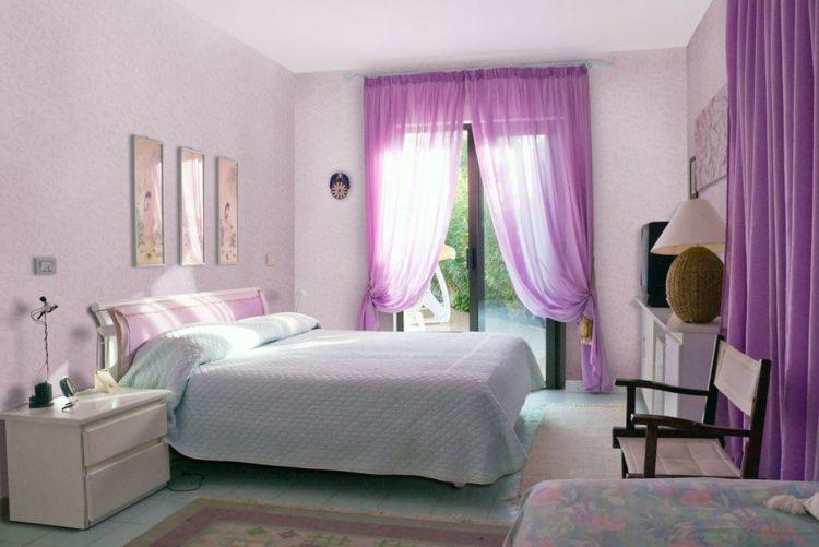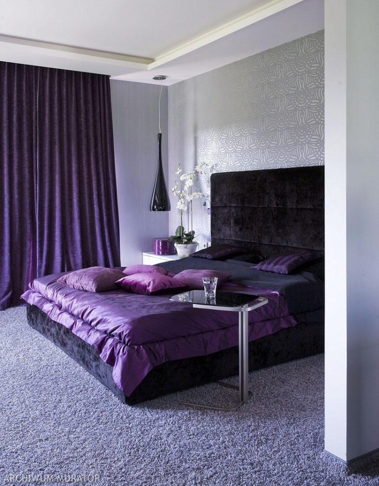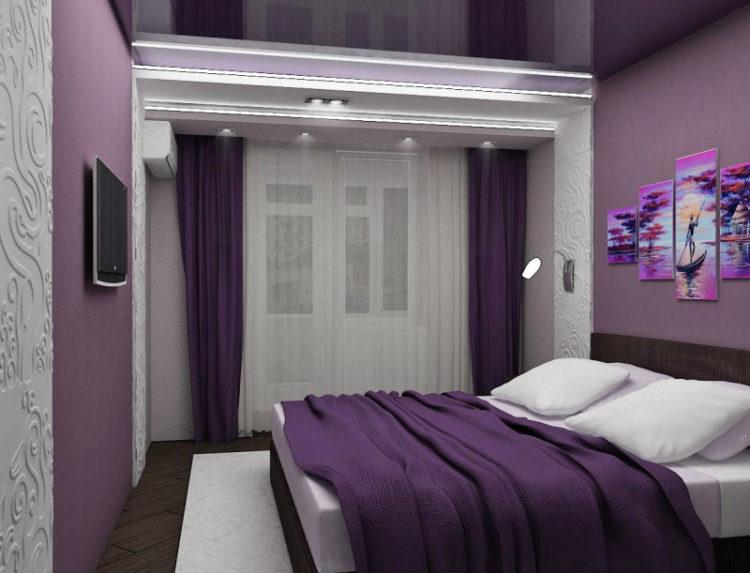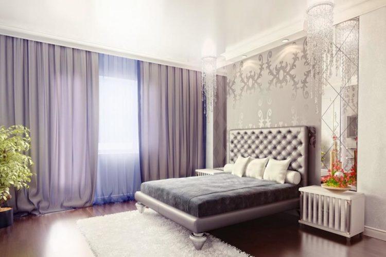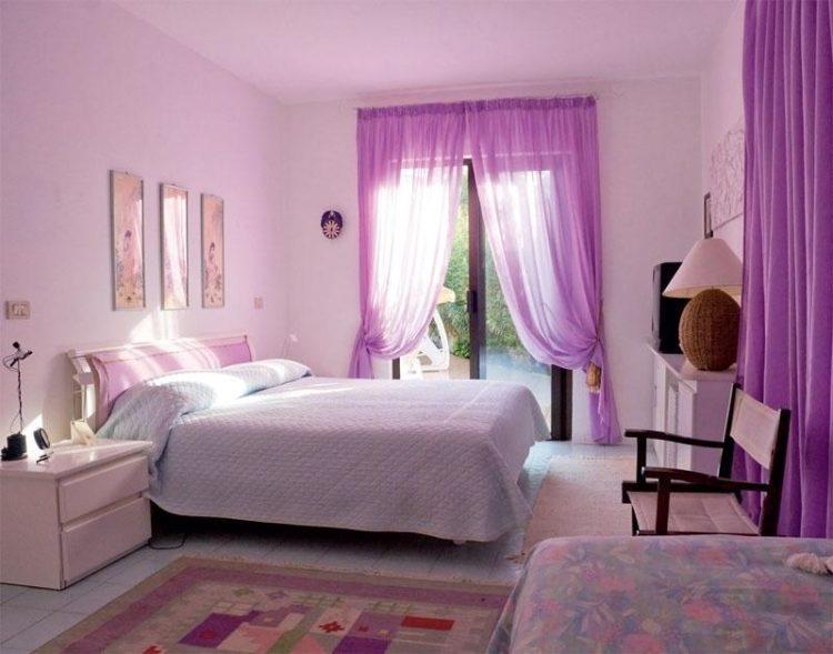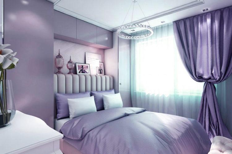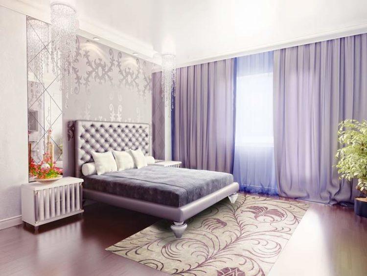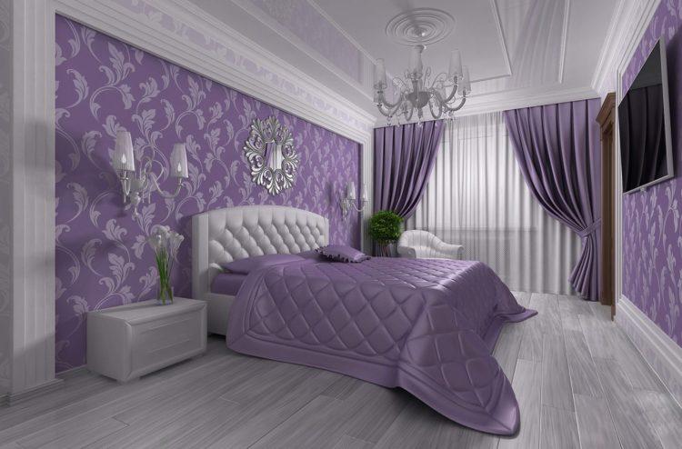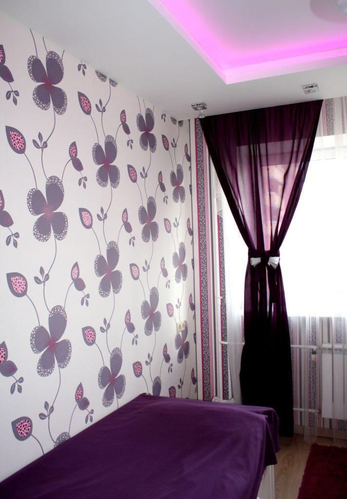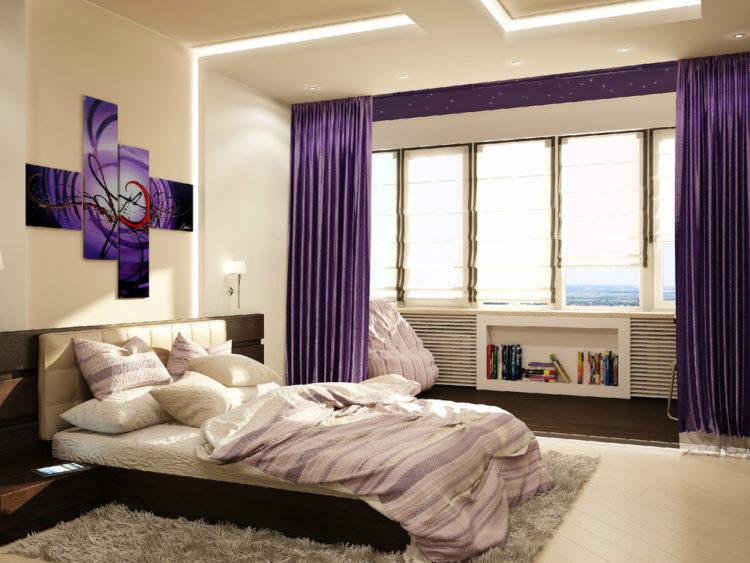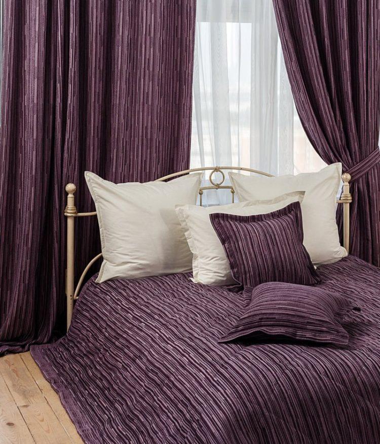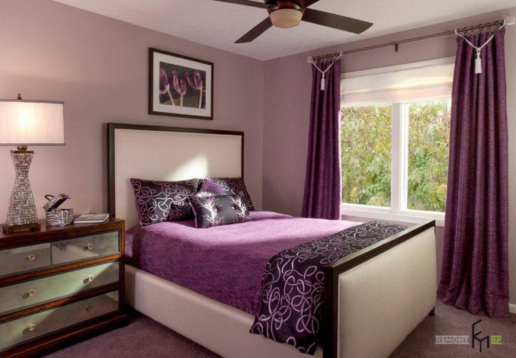 - Papel tapiz negro y cortinas de color lila en el dormitorio (fotos, ideas de diseño)