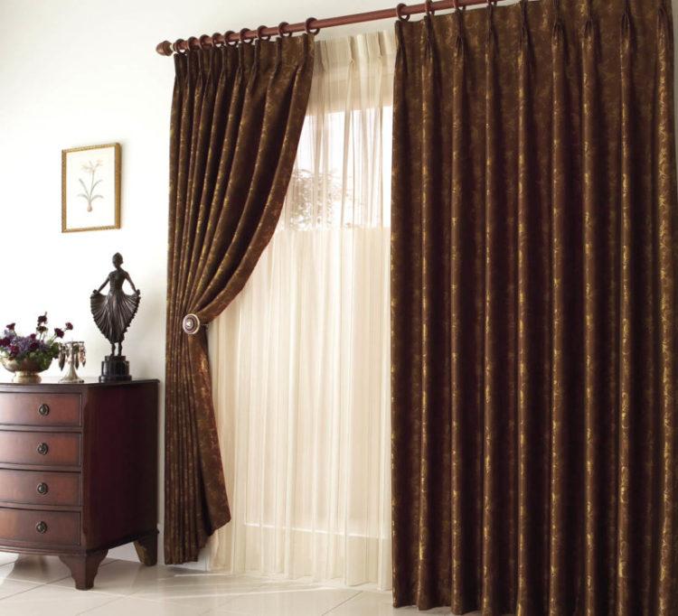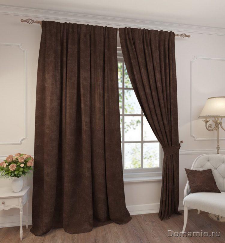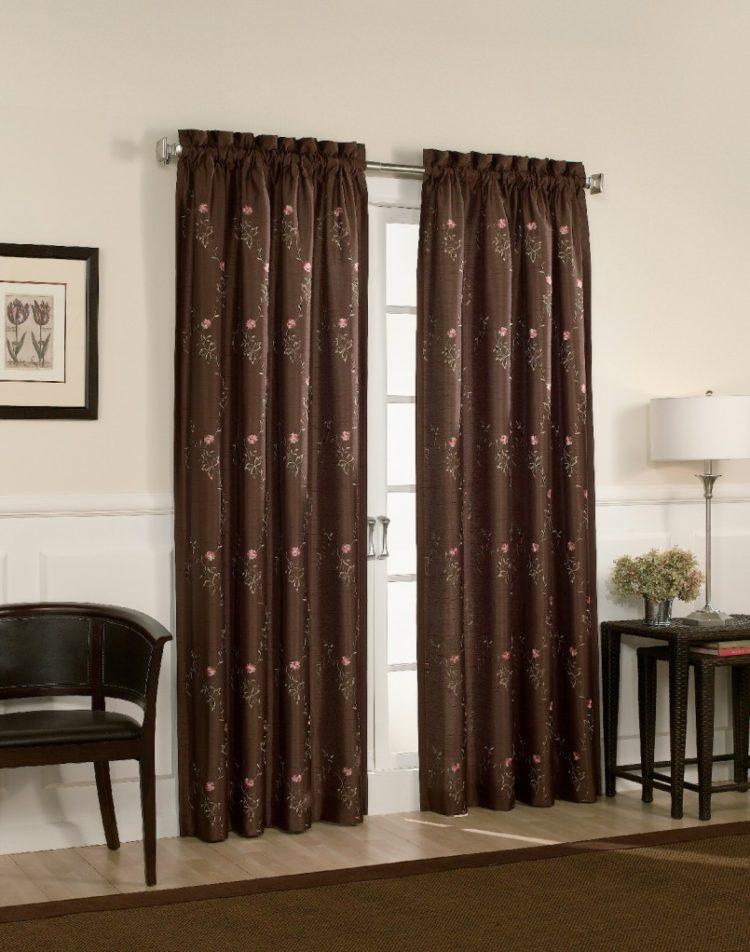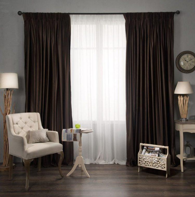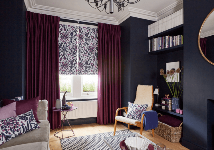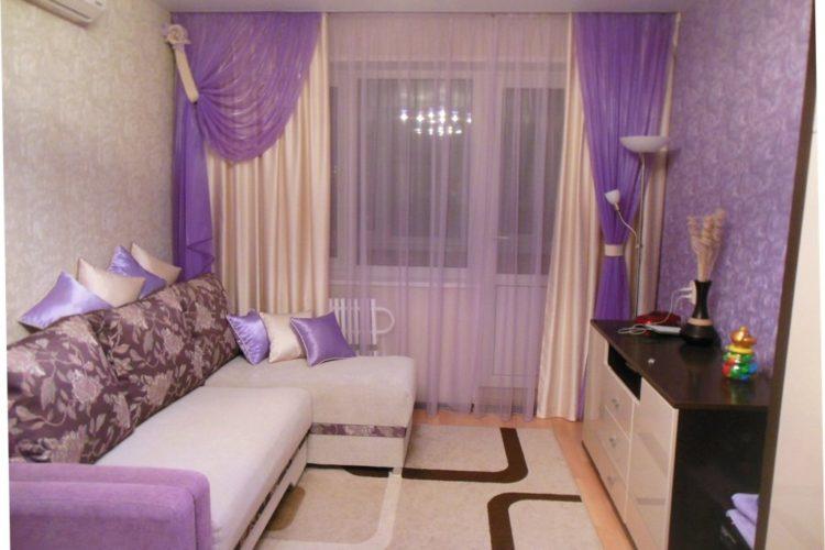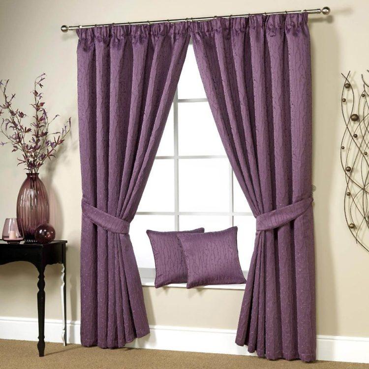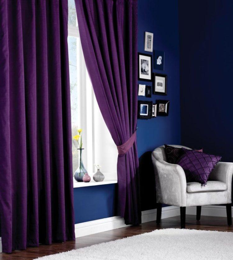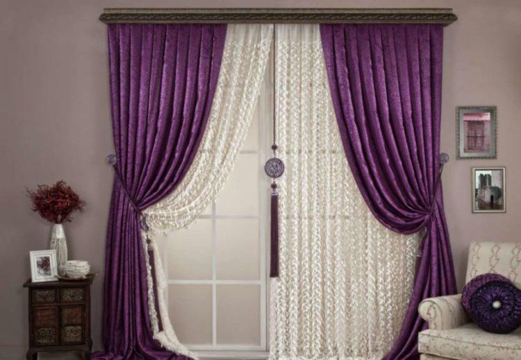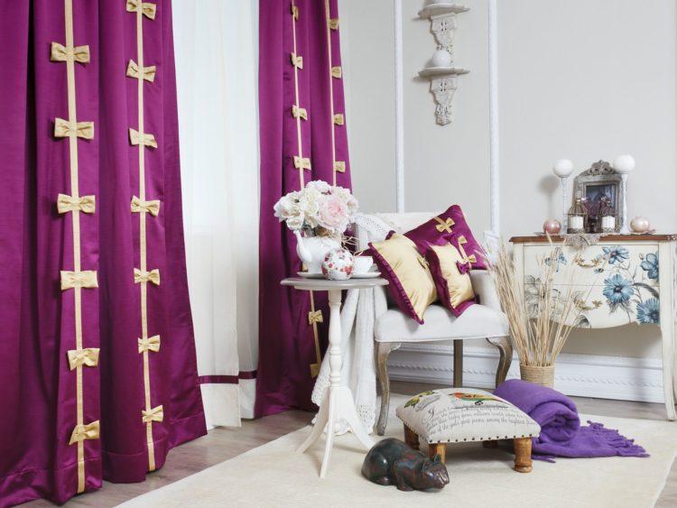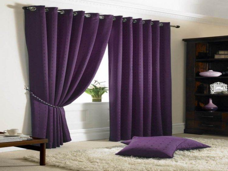 - Cortinas color lilas oscuras en el interior de la sala de estar (foto de ejemplos confeccionados)