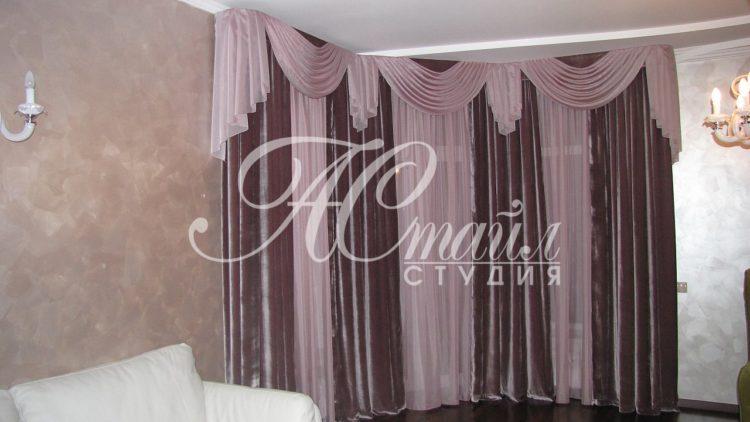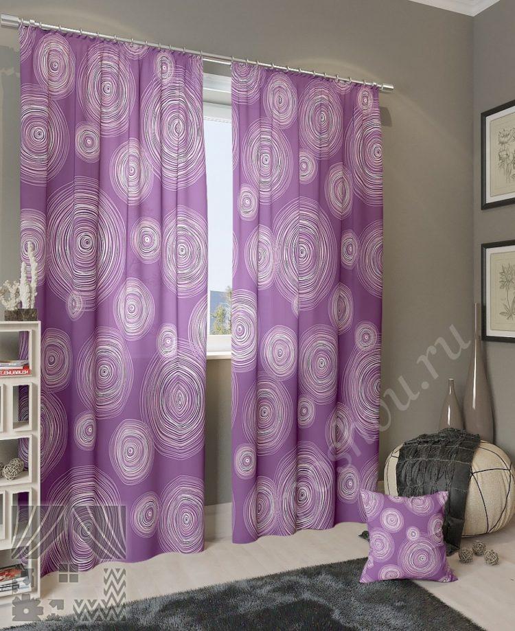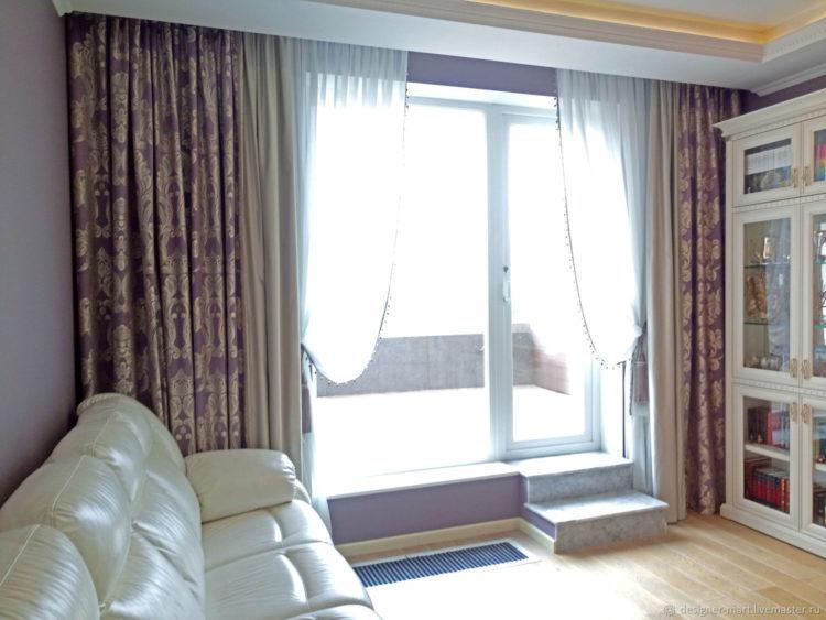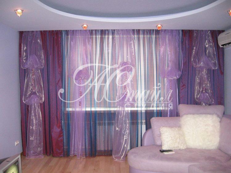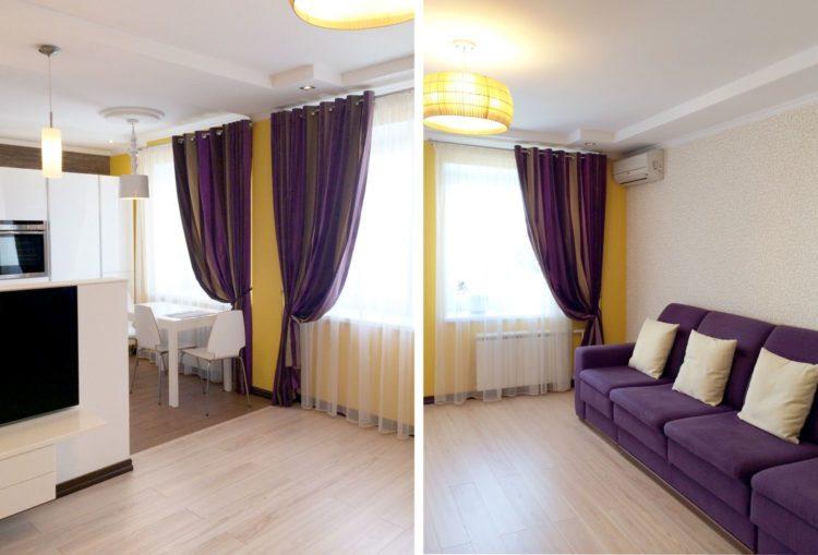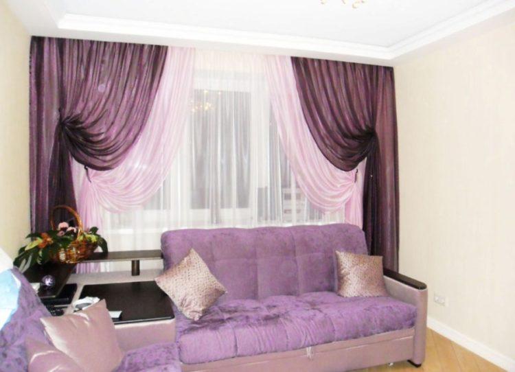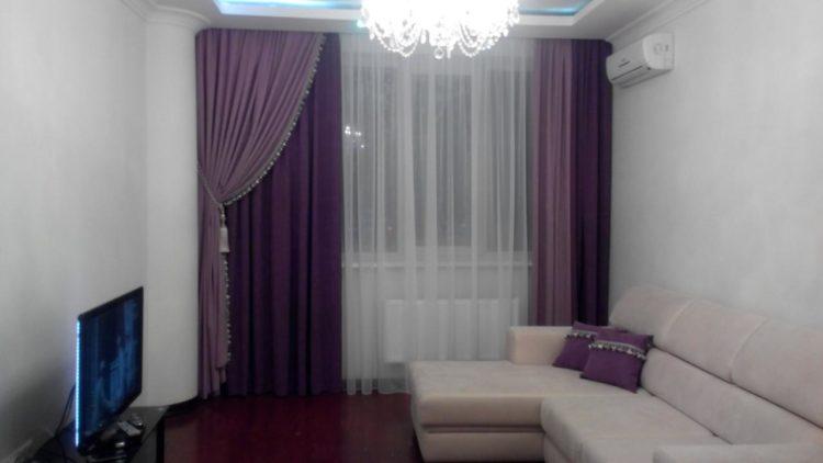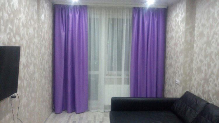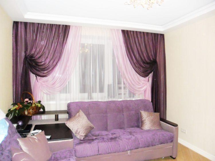 Cortinas color lilas oscuras en el interior de la sala de estar (foto de ejemplos confeccionados)