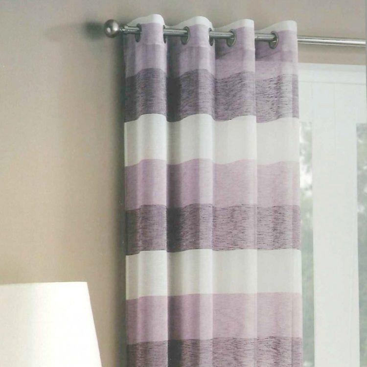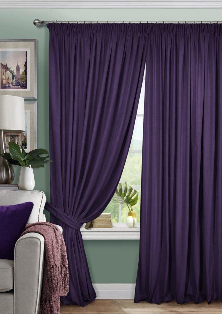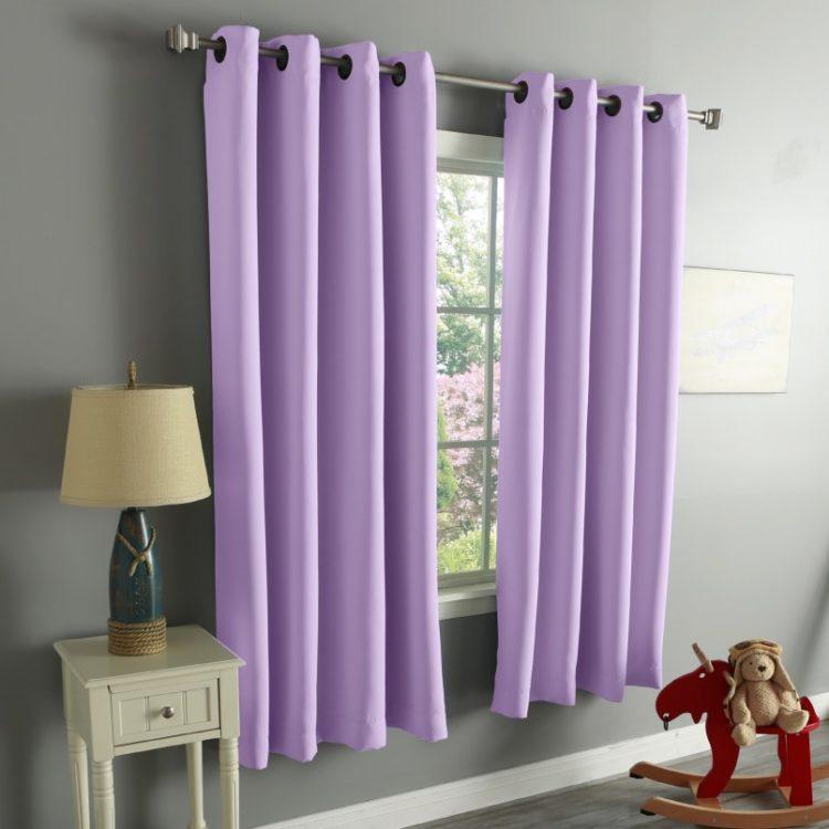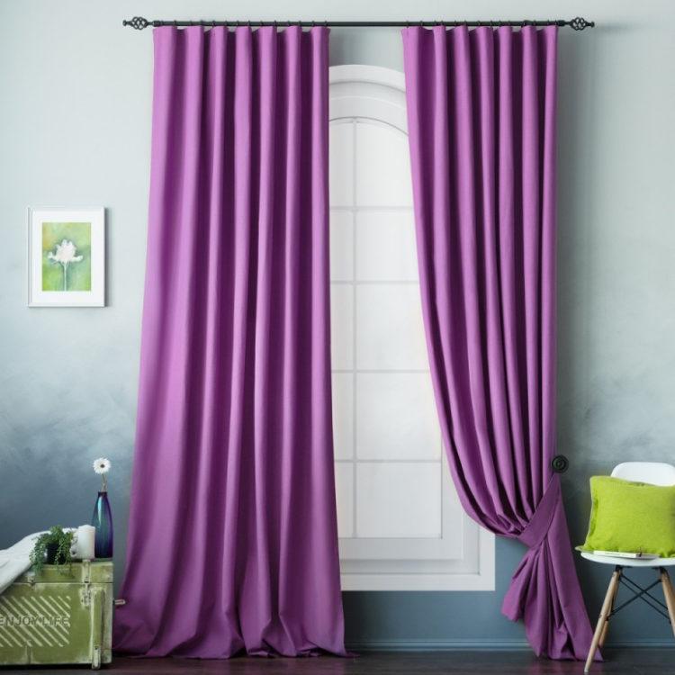 Las cortinas de lavanda oscura se usan mejor en el dormitorio. En el pasillo debes elegir versiones más brillantes.