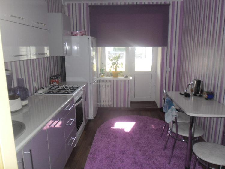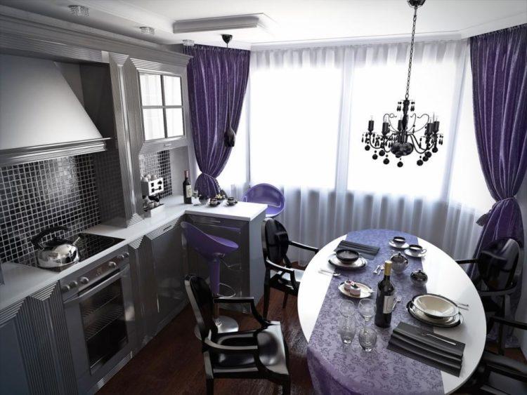 - Papel tapiz blanco y cortinas moradas en la cocina