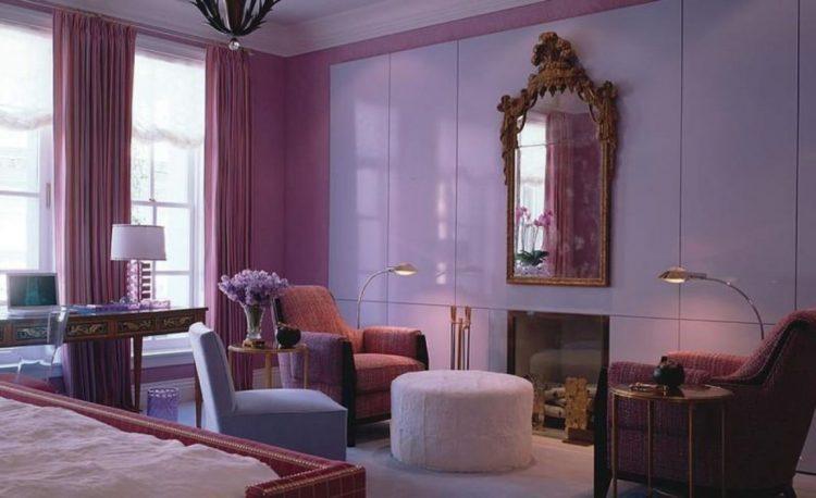 Papeles pintados rojos y cortinas lilas en el interior del dormitorio.
