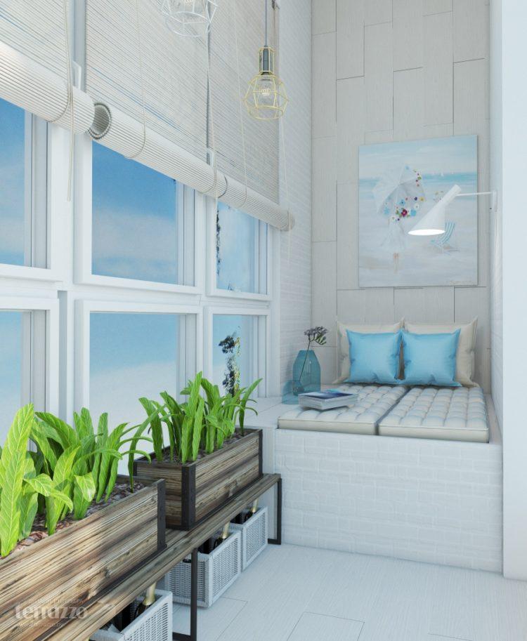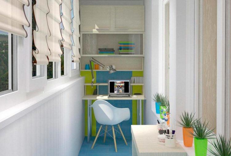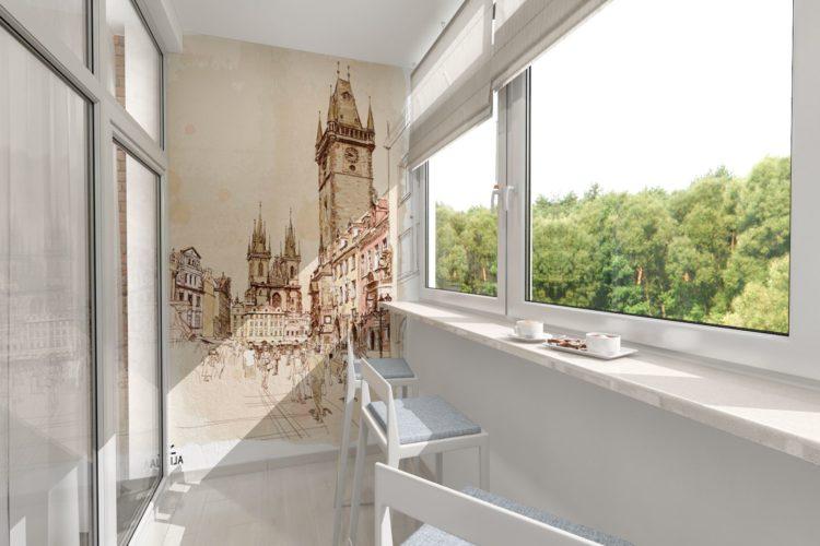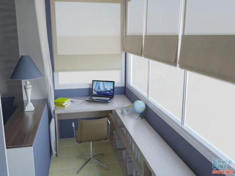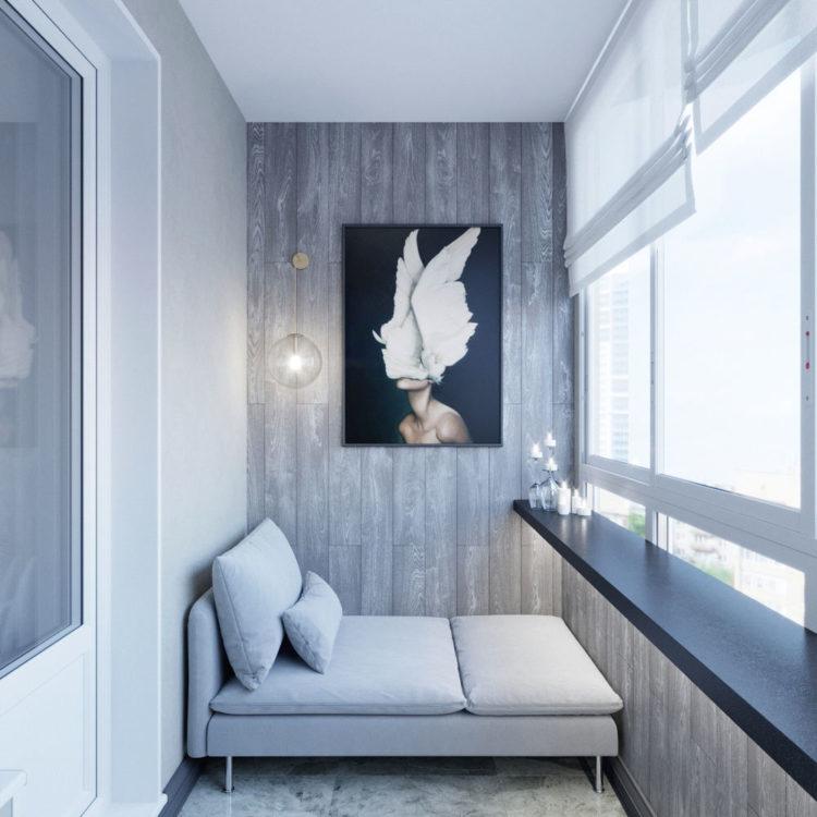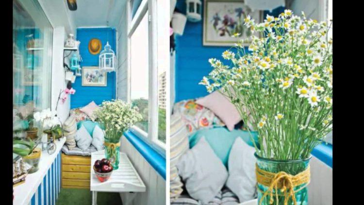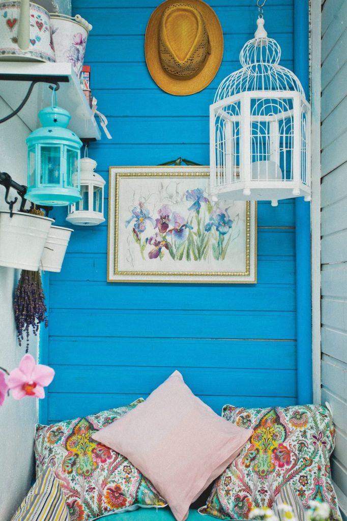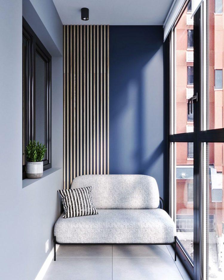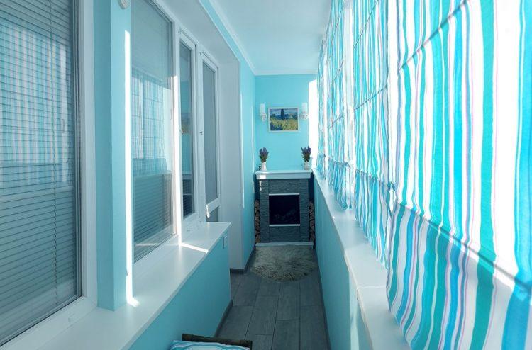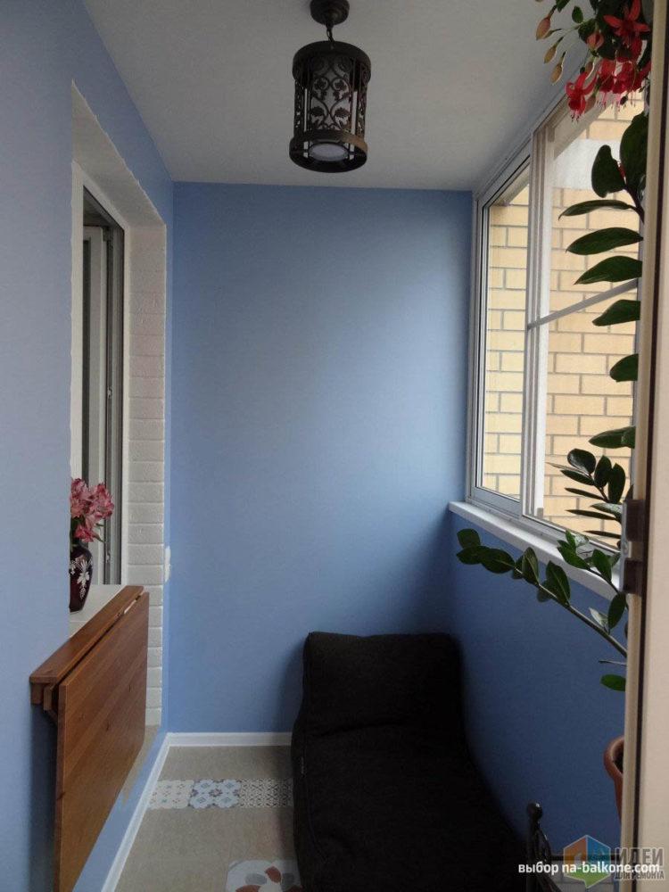 Teniendo en cuenta las opciones de diseño para las paredes de un pequeño balcón, asegúrese de prestar atención a los tonos azules y azules. Aumentan visualmente un espacio pequeño.