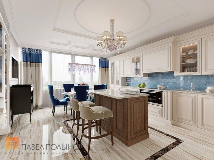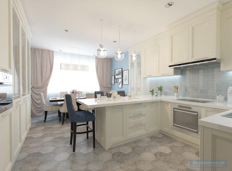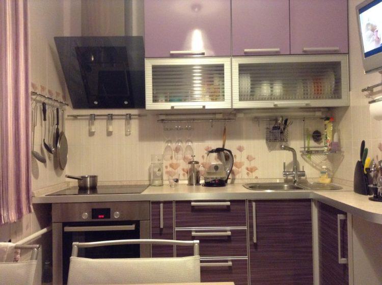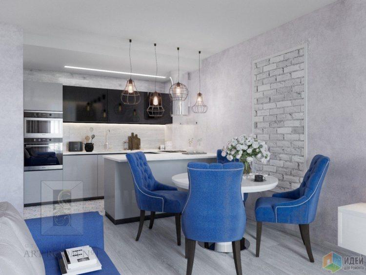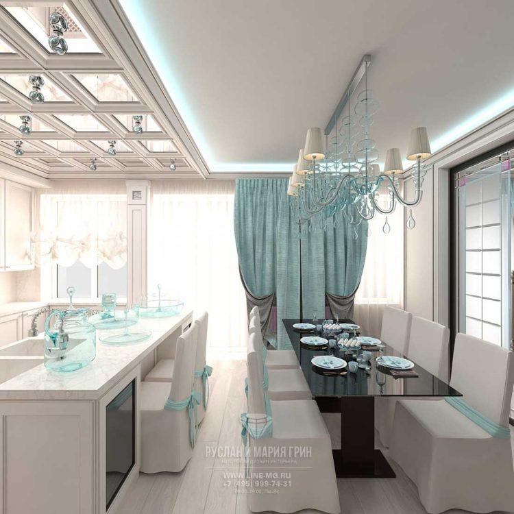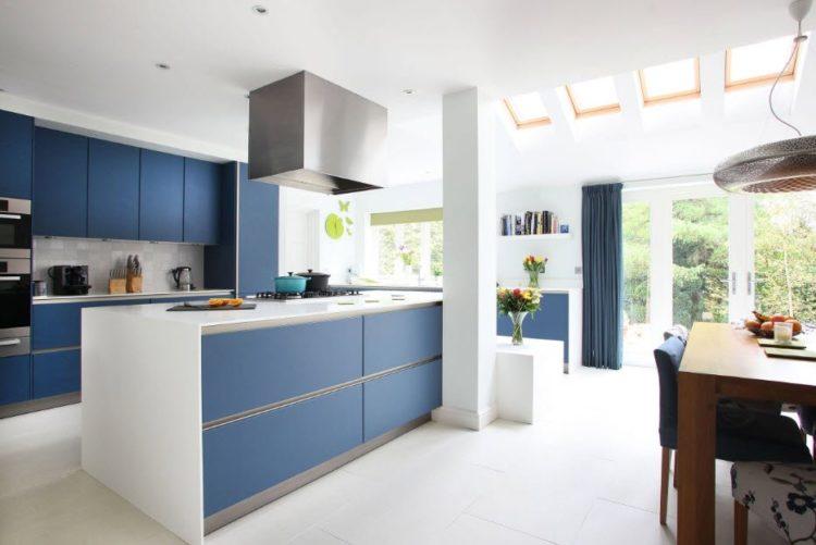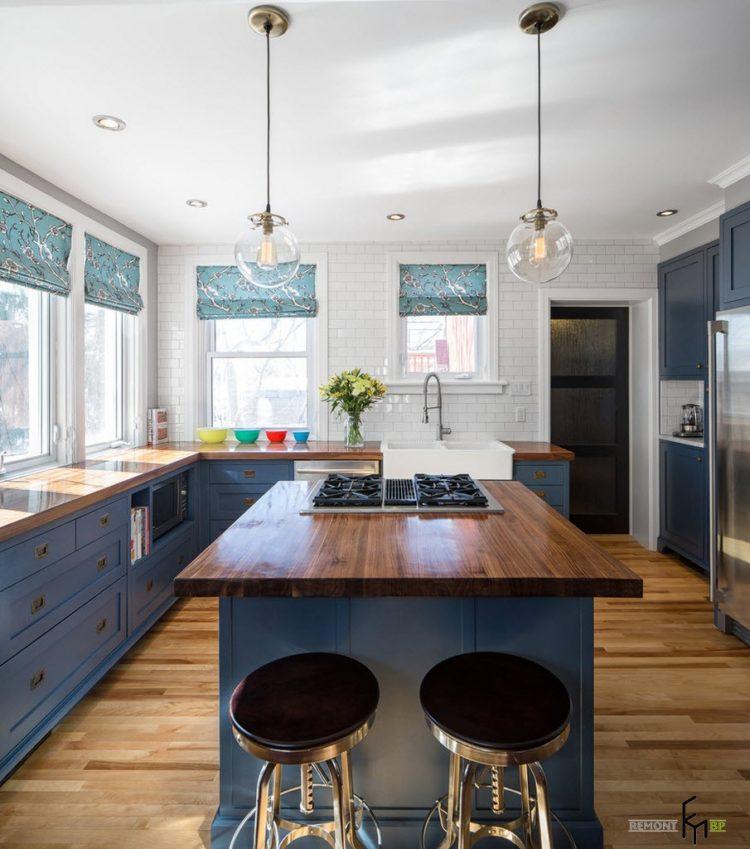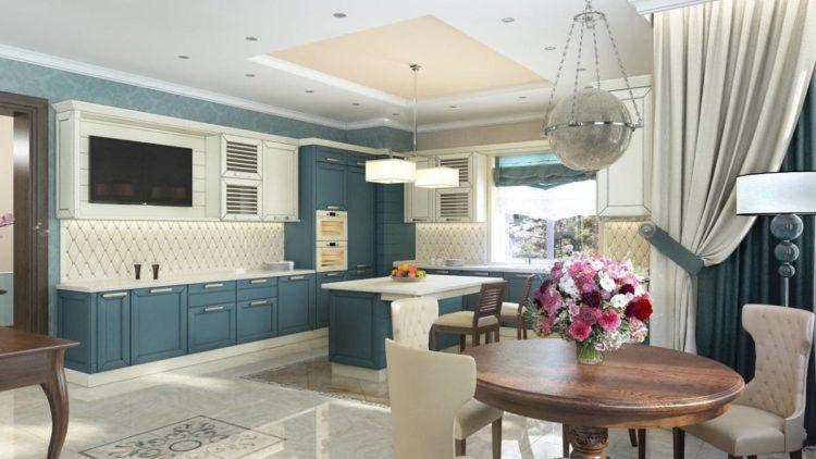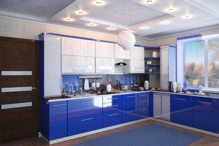 Si está interesado en cómo montar las varillas sobre la superficie de trabajo y qué tipo de soportes se necesitan para esto, preste atención a los rieles azules del techo. También son adecuados solo para cocinas decoradas en los mismos colores.