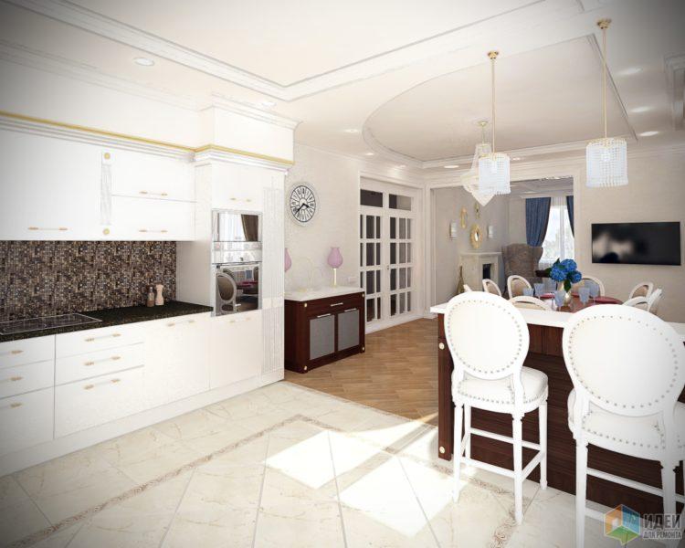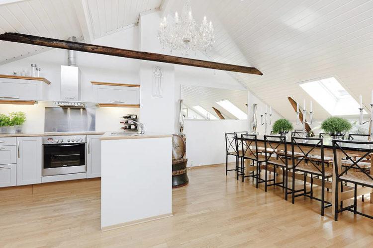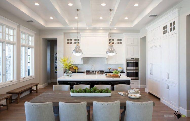 Las barras de techo en la cocina pueden ser blancas. Al mismo tiempo, se cuelgan no solo por encima de la superficie de trabajo, sino también como un elemento individual del interior.