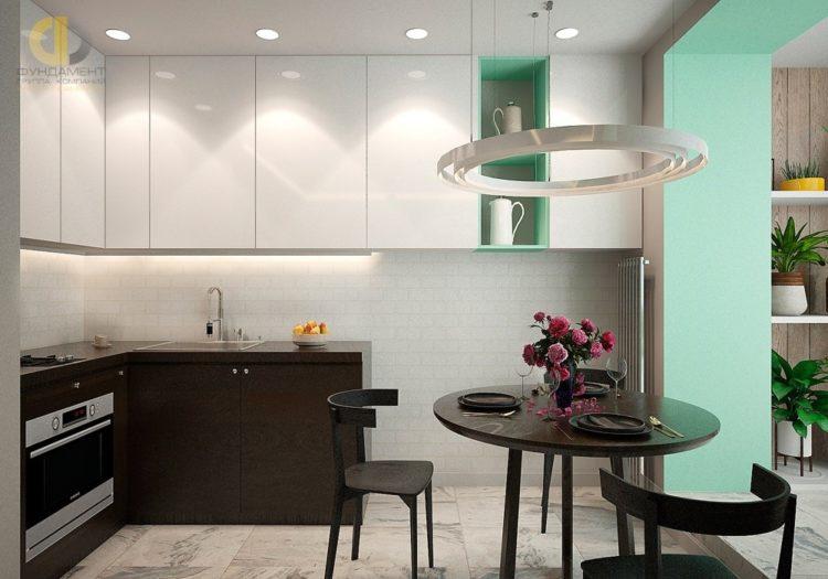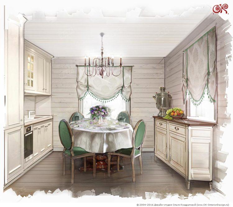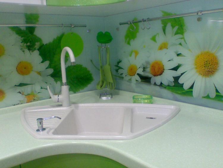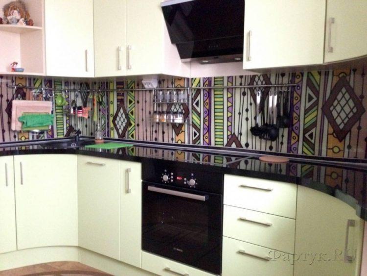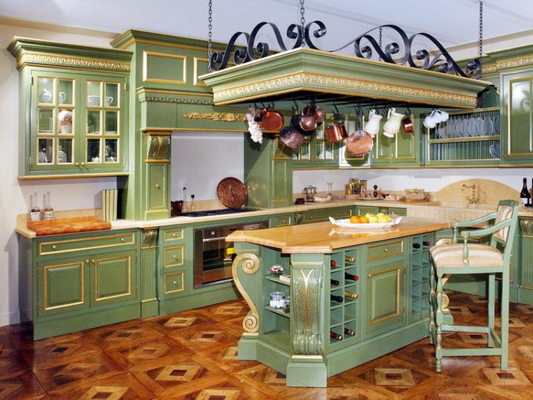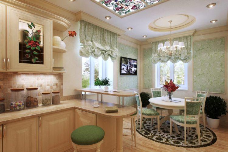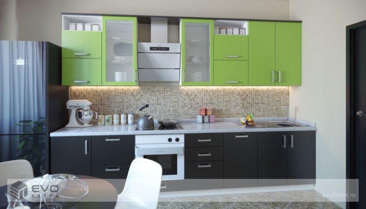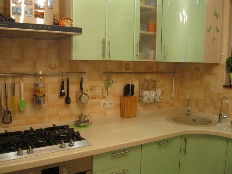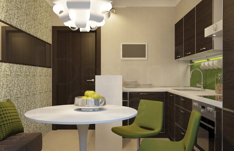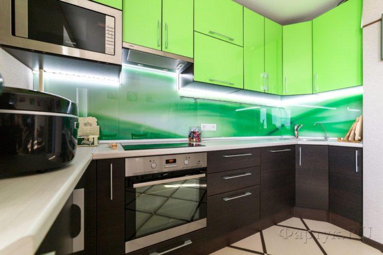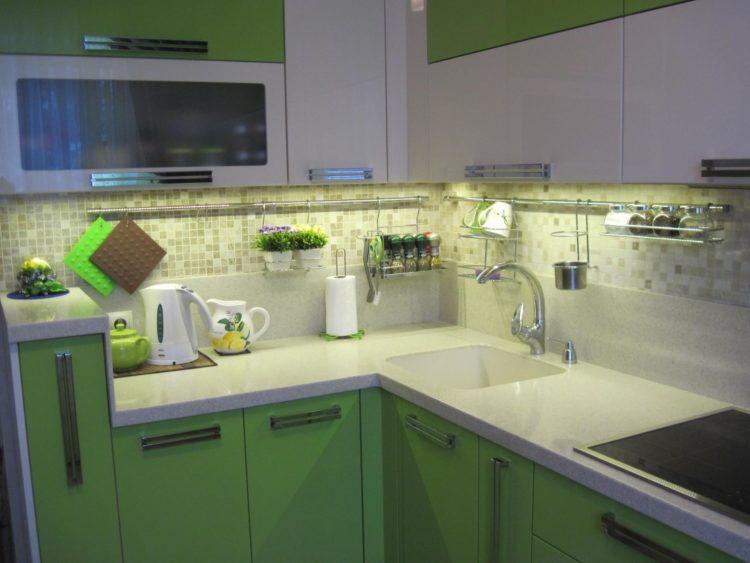 La barra de la cocina en el delantal puede ser verde. Lo principal es que se combina con el esquema de color general de toda la habitación.