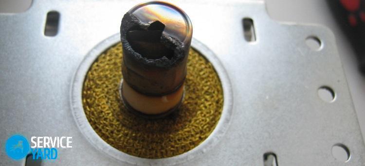 - Filamento roto La causa de este mal funcionamiento es el sobrecalentamiento del magnetrón. Encender el horno con una cámara vacía o una carga inadecuada puede hacer que el filamento se "autocaliente". Puede diagnosticar una falla midiendo la resistencia entre las patas del condensador. Normalmente, su valor es de 5 a 7 ohmios.