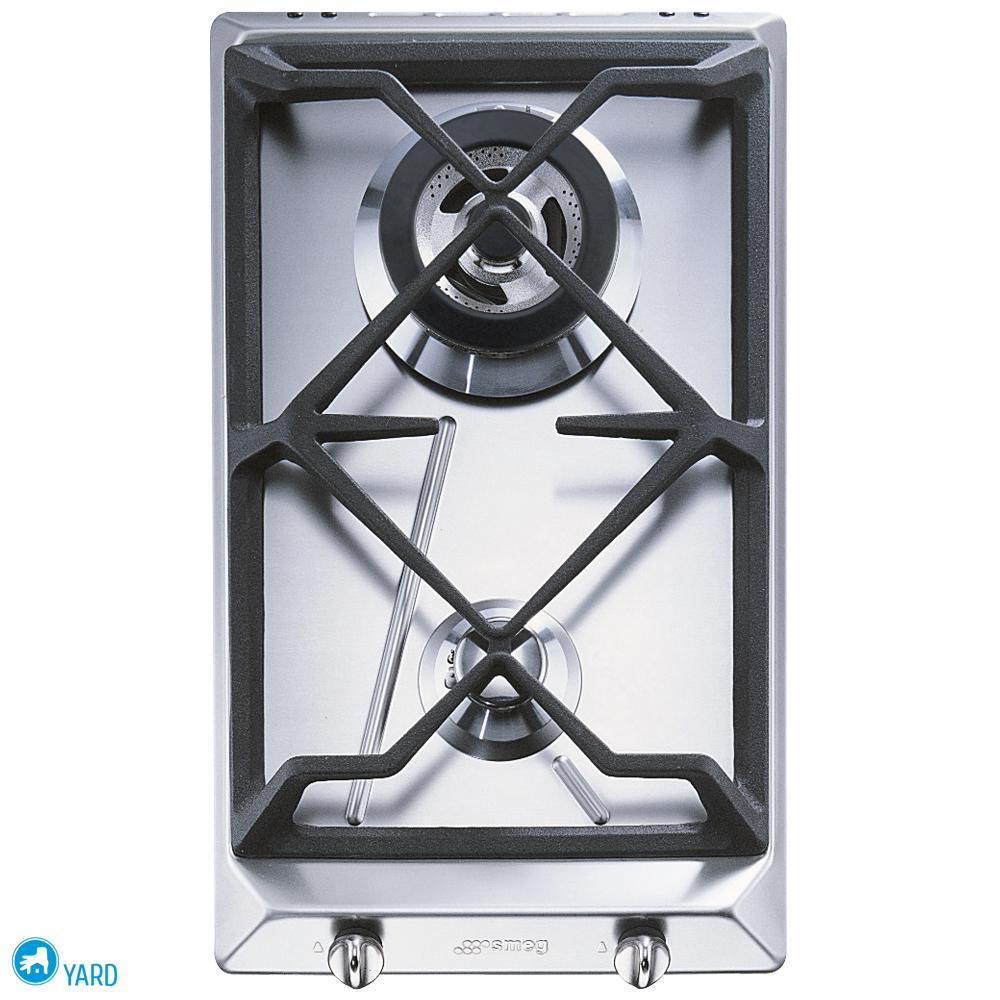 Cocina integrada independiente de la empresa italiana Smeg. Incrustado en el mismo nivel que la encimera. La base está hecha de acero inoxidable. Rejillas de hierro fundido, cubiertas de quemadores de metal esmaltado. Solo 4 quemadores de gas. Poder: