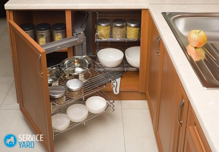 - Esquina (montada y piso). Para apartamentos pequeños con cocinas pequeñas, un gabinete de esquina ubicado en la unión de la pared del mueble es un lugar muy popular para instalar un secador de platos. Al elegir esta opción, preste atención al hecho de que el secado no debe tener una forma rectangular, sino triangular, entonces encajará fácilmente en la esquina.