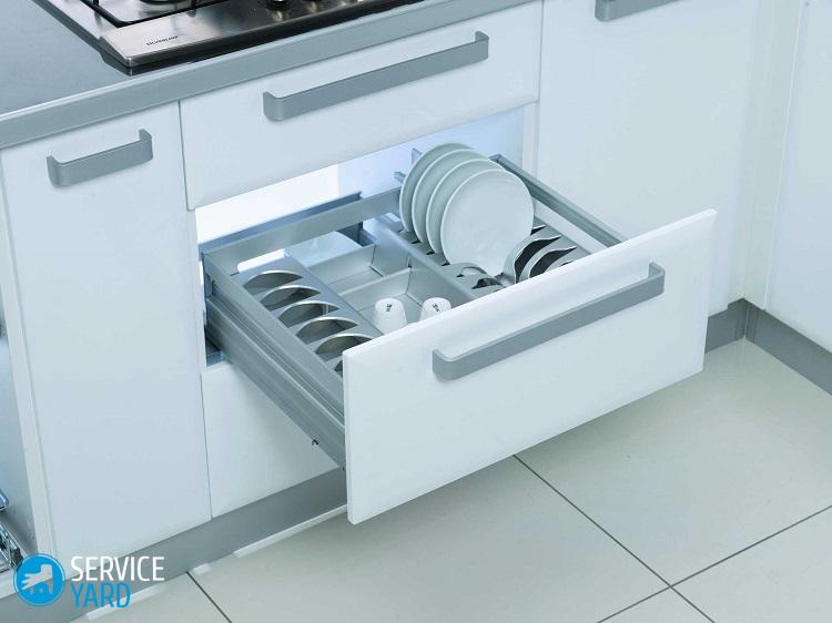 Importante! En unidades de cocina pequeñas, coloque los platos en secadoras ubicadas en cajones cerca del fregadero. Esta opción tiene muchas ventajas: es más fácil sacar los platos de la secadora, ya que se encuentra debajo y los cajones se extraen fácilmente.